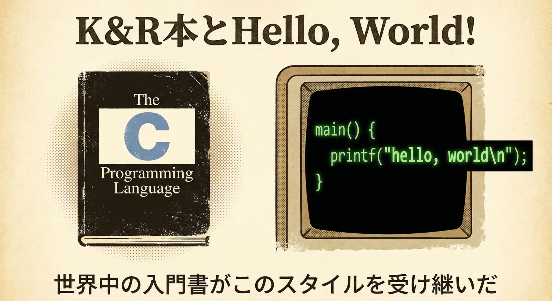 「Hello, World!」は、ベル研究所のB言語とC言語の教科書を起点に広まり、今日では入門の定番となりました。