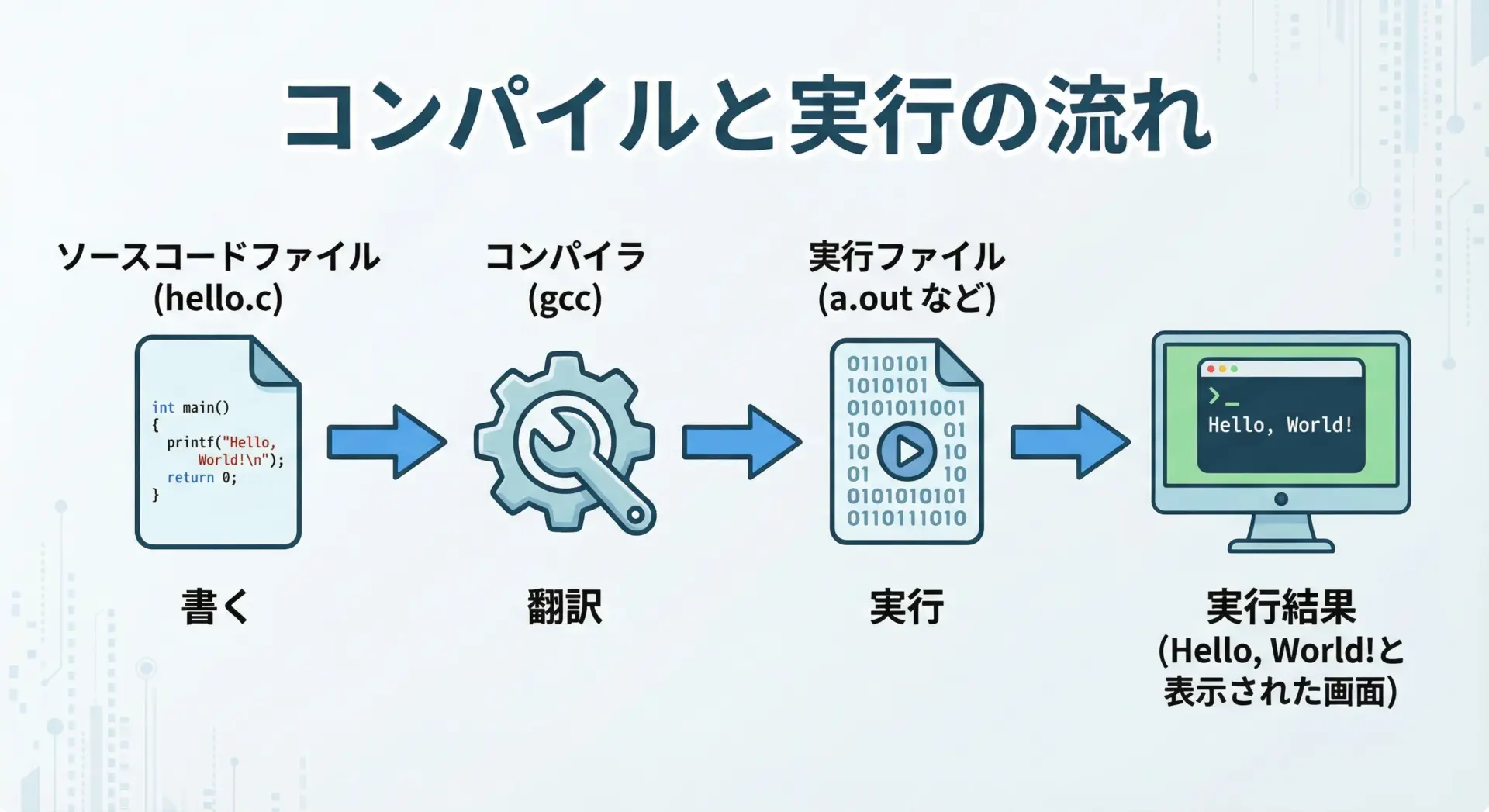 「文字が画面に出る」だけで、エディタやコンパイラ、実行環境など一連の流れが連携していることが確認できます。