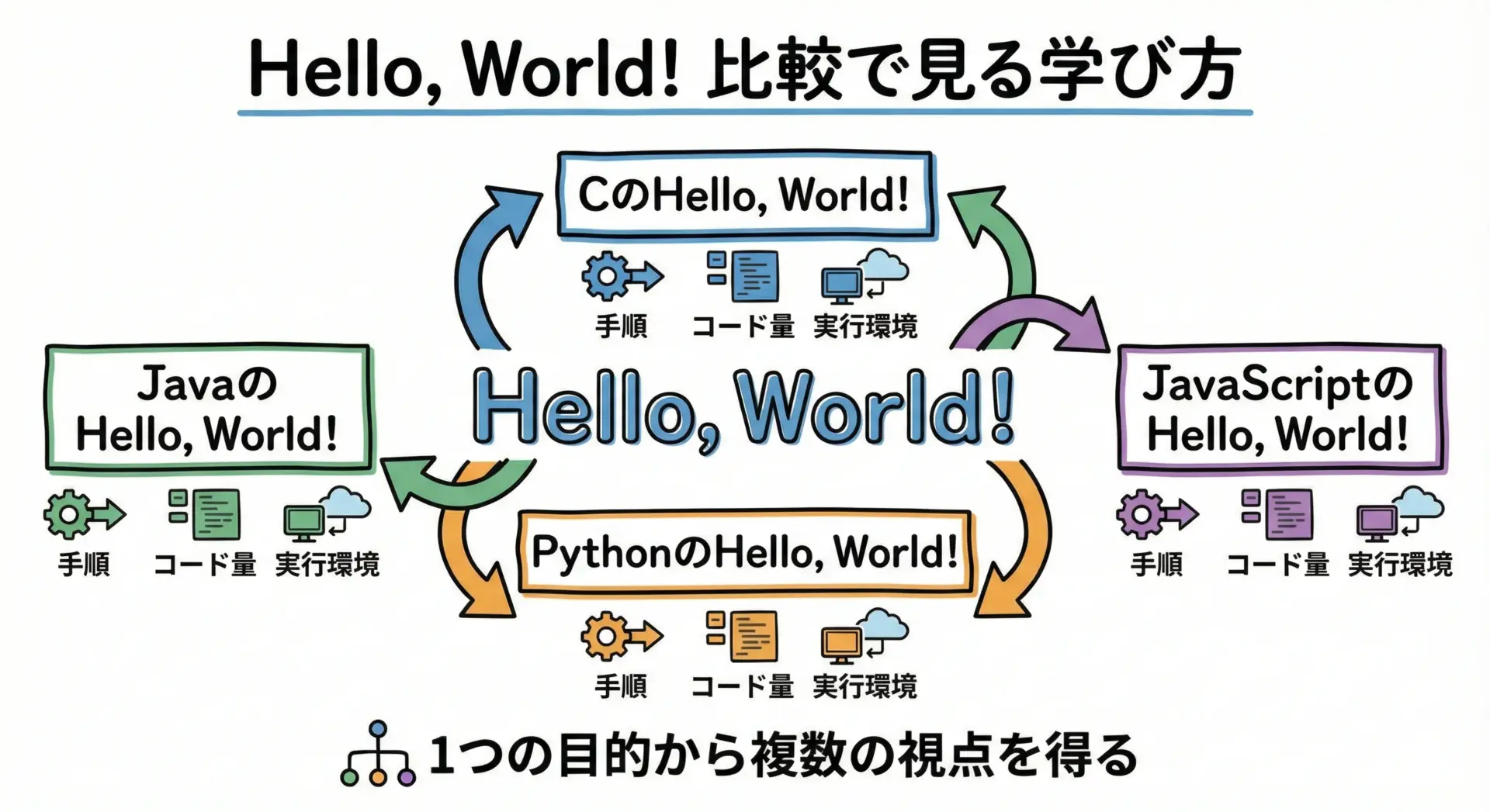 「Hello, World!」は短く、環境を問わず再現しやすいことが最大の理由です。