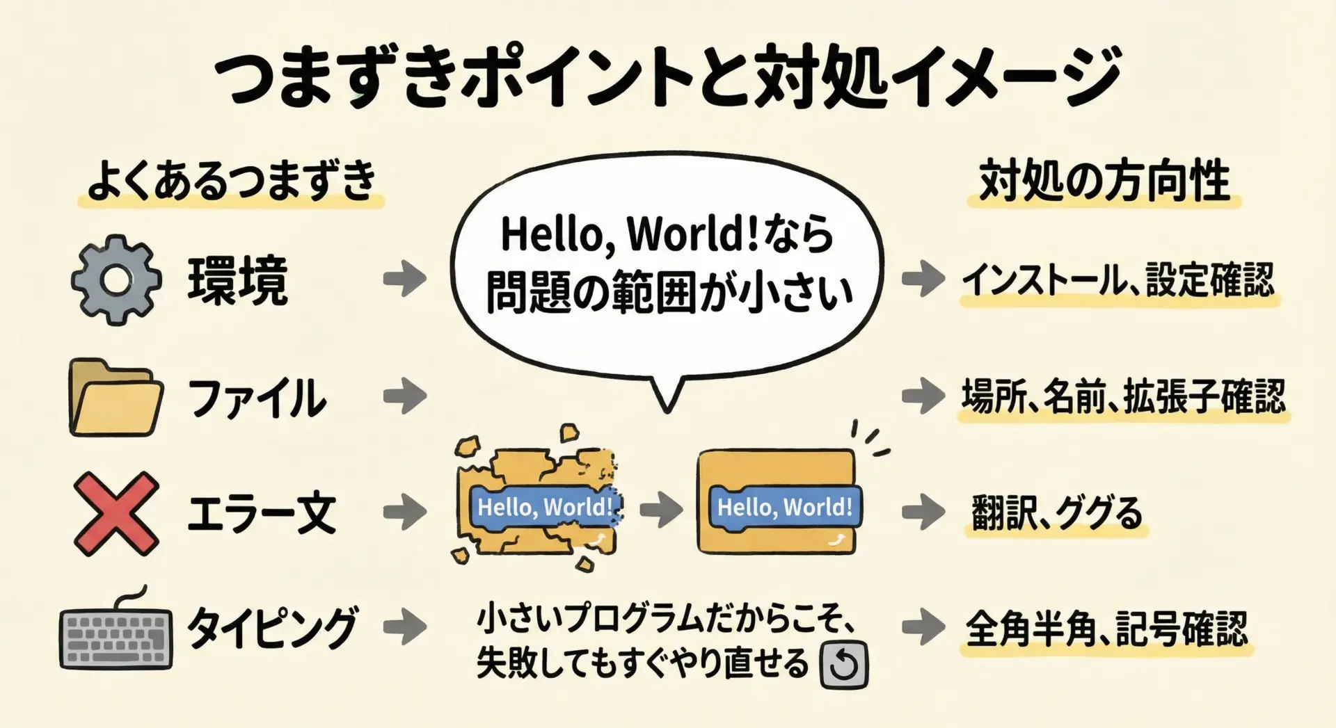 まずは自分の環境で1行を動かす経験を最優先にしましょう。