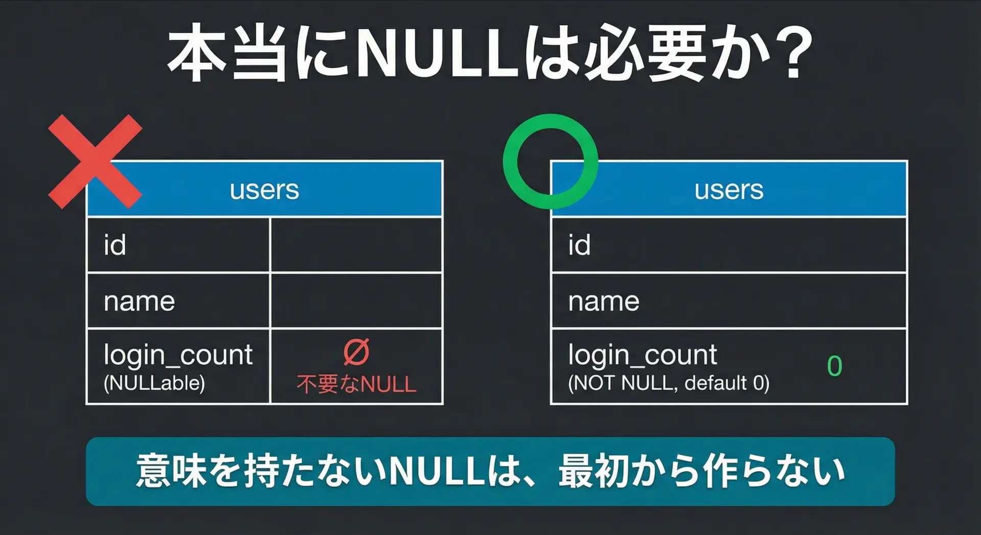 まず大切なのは、「なくてもよいNULLは、そもそも作らない」という設計方針です。