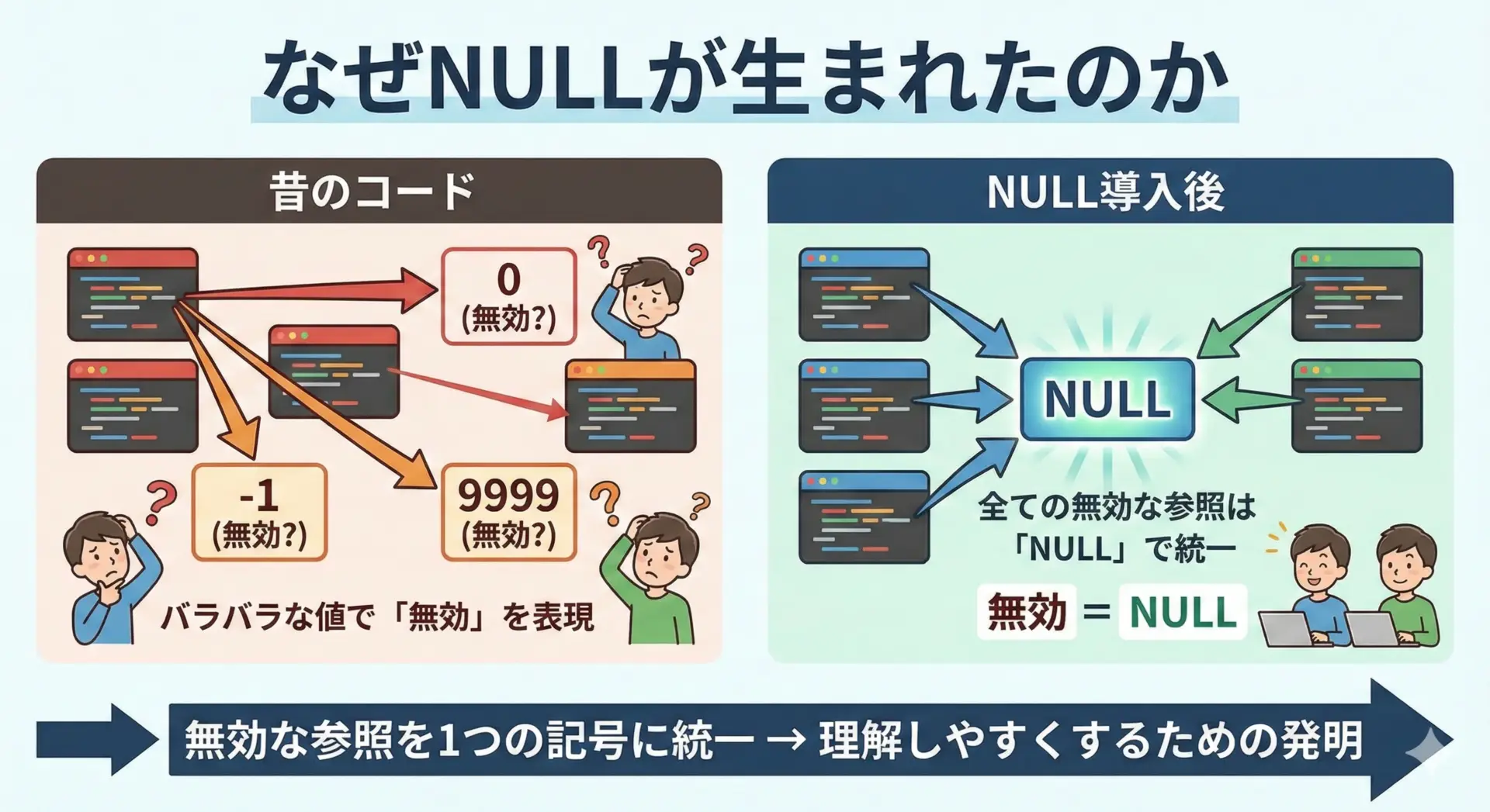 この記事では、NULLの正体や歴史的背景、よくあるトラブル、そしてうまく付き合うための設計のコツまで、丁寧に整理していきます。