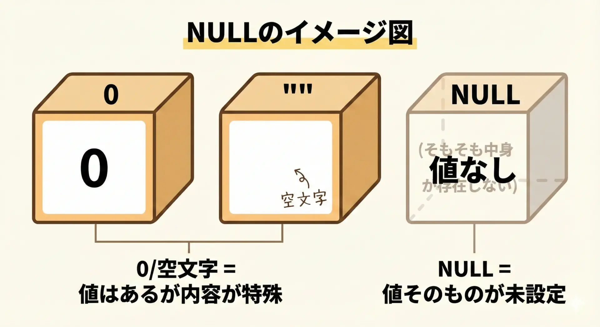 0や空文字は「存在しているが、内容が特別な値」であり、NULLは「存在自体がまだ不明」を意味します。