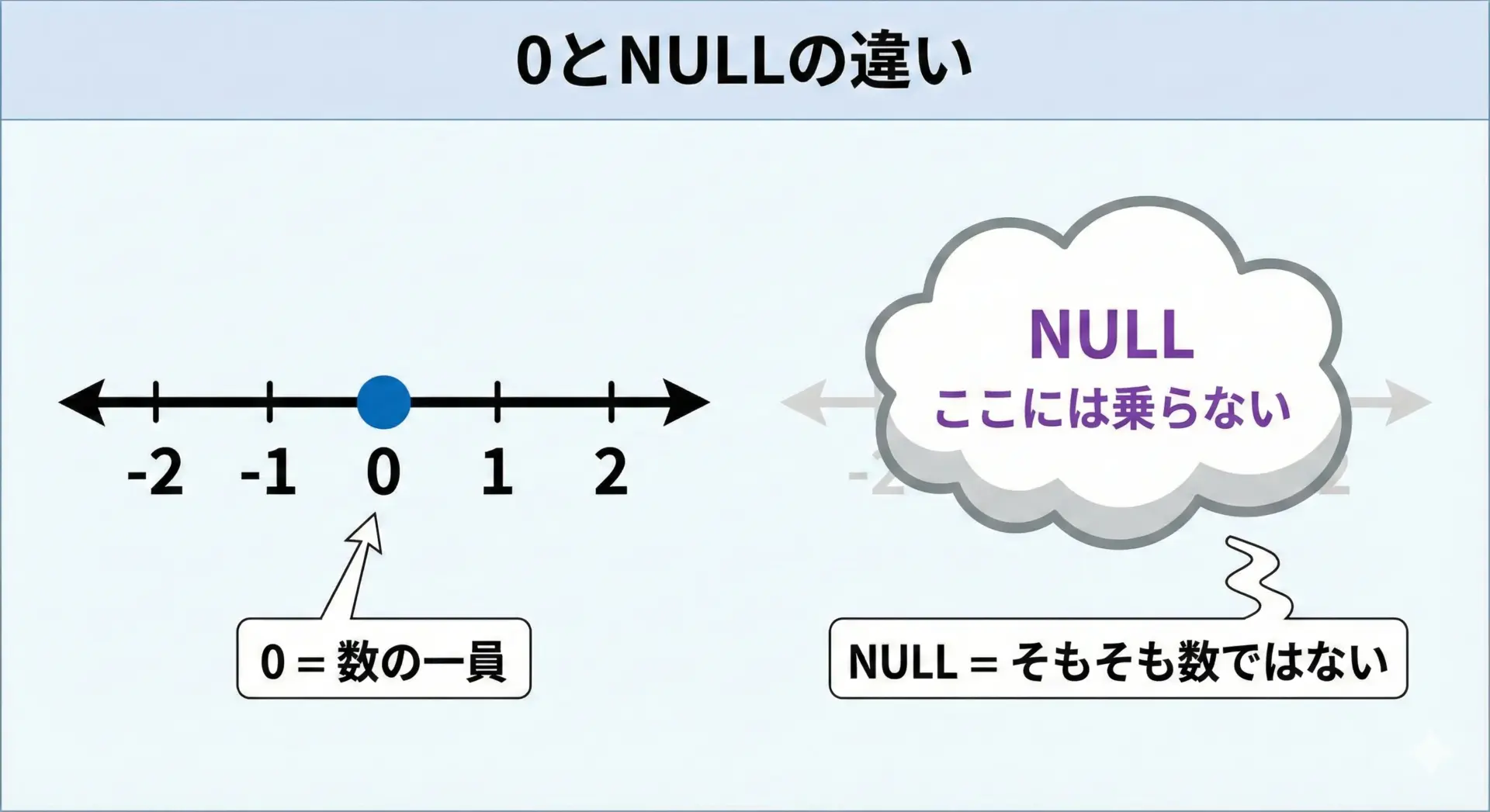 「0は数値計算の仲間」「NULLは計算の土俵にすら上がってこない存在」という整理が役立ちます。