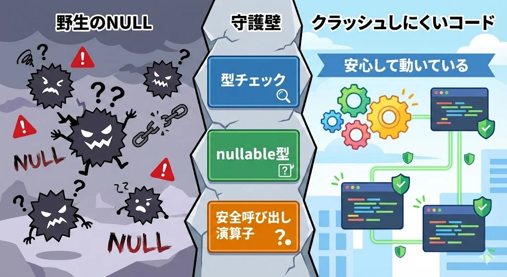 「nullを許すかどうか」が型として明示されるため、コンパイラが「この変数はnullかもしれないから、ちゃんとチェックしなさい」と警告してくれます。