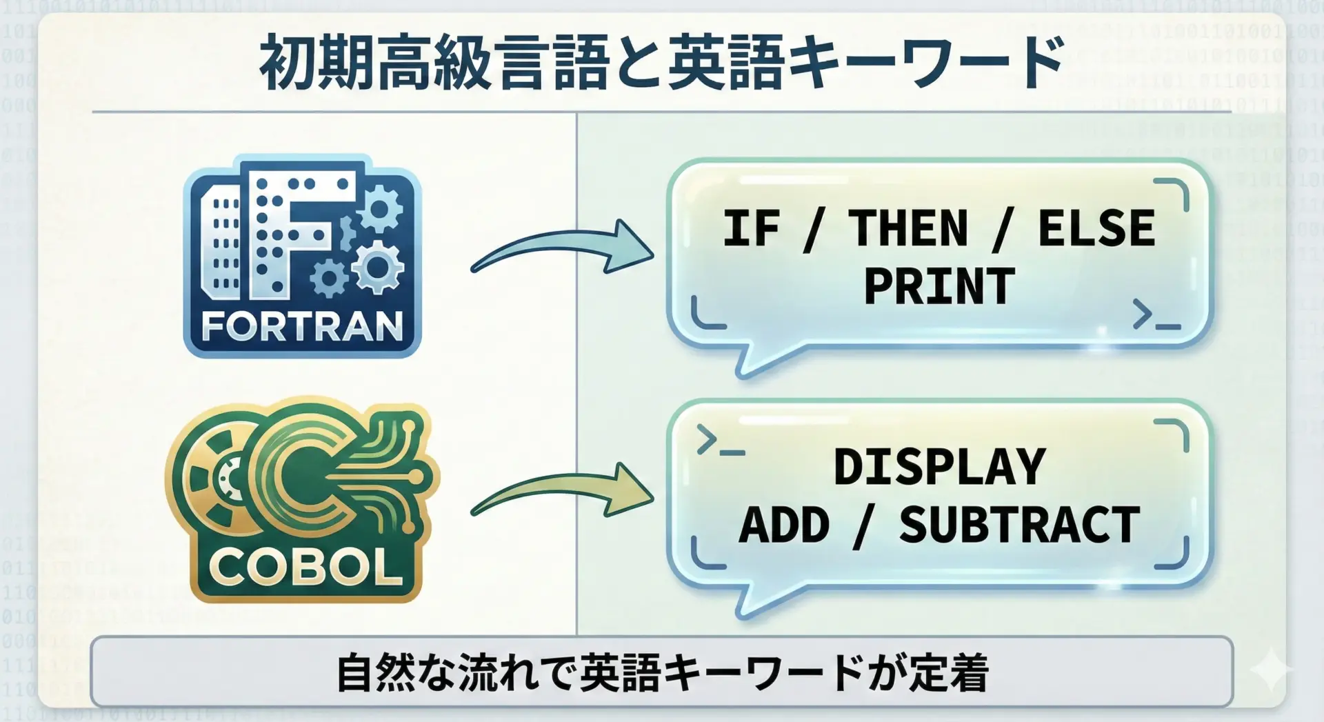 これらの言語設計者もアメリカの企業や研究者であり、仕様書やコンパイラも英語で作られたため、そのまま英語ベースのキーワードが標準となりました。