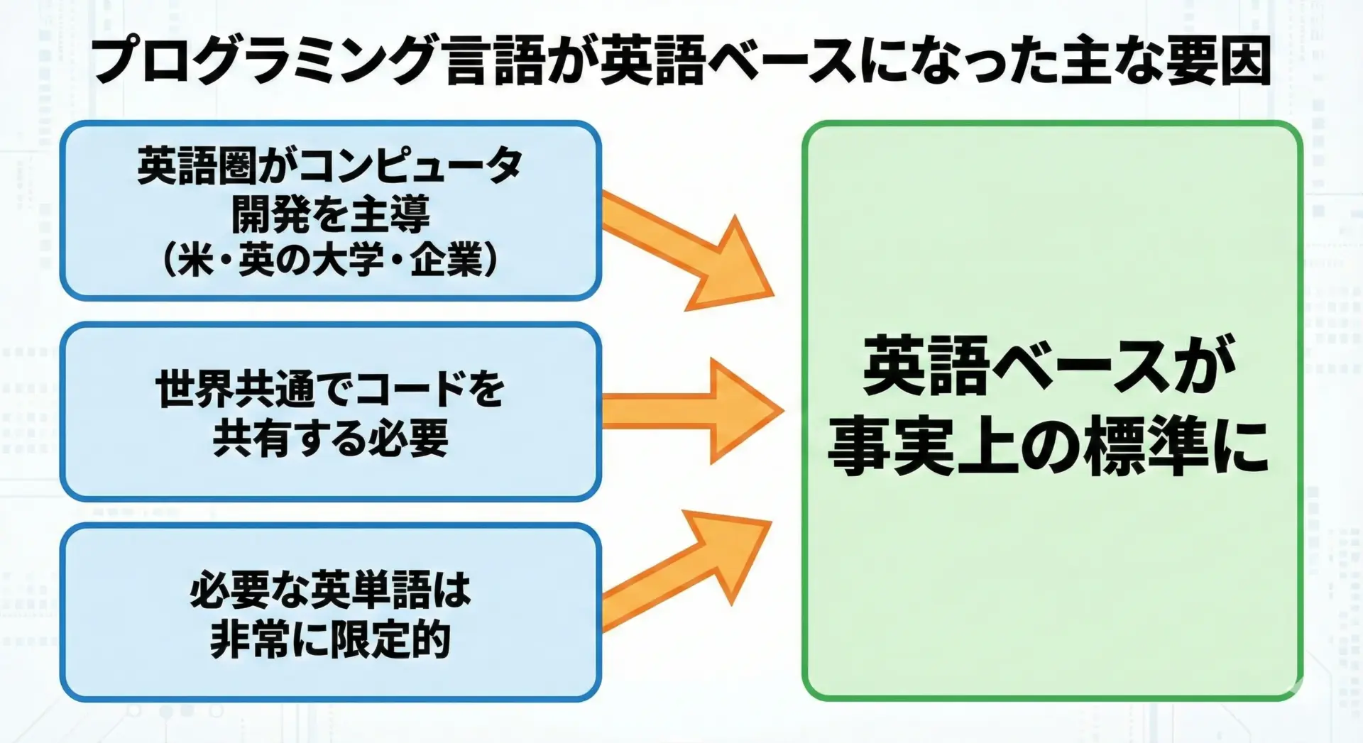 多くのプログラミング言語が英語ベースになっている最大の理由は、コンピュータの発展を主導したのが英語圏の研究者・企業だったからです。