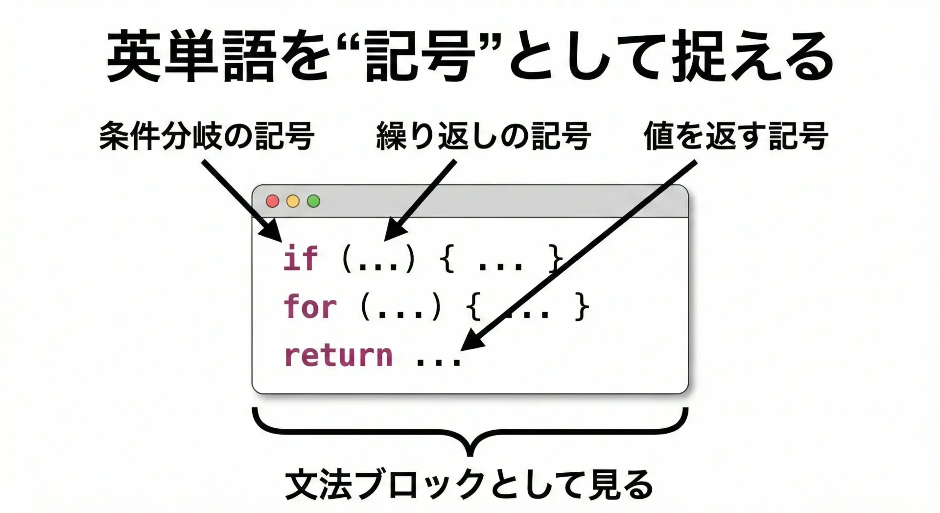 これからプログラミングを学ぶ方は、まずは最低限の英語キーワードと構文パターンを、「コードの形」とセットで覚えるところから始めてみてください。