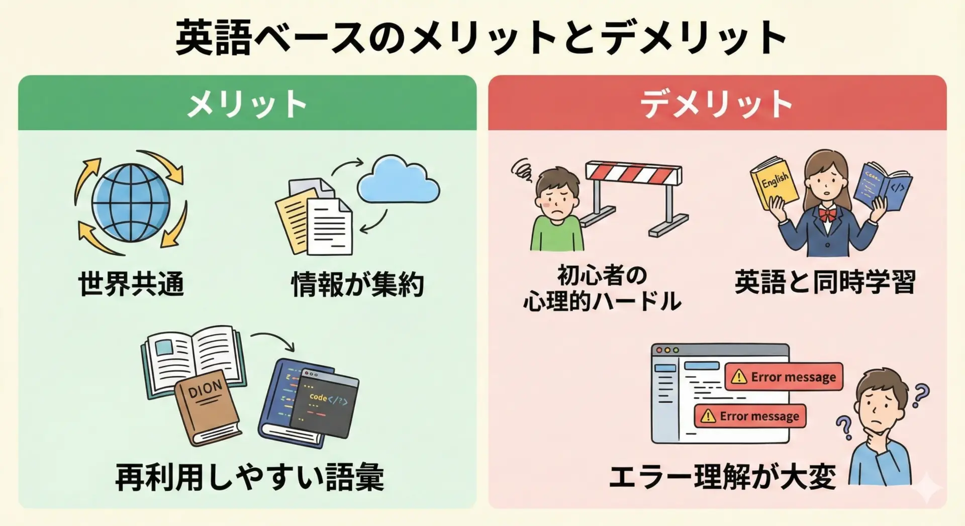 英語ベースであることには、世界中でコードを共有しやすい、情報が集約されやすいといった大きなメリットがある一方、初心者にとっての心理的ハードルや、英語とプログラミングの二重学習といったデメリットも存在します。