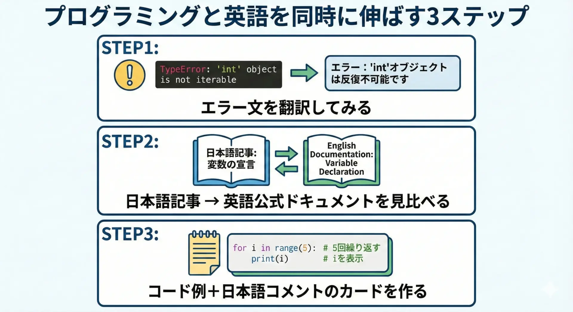 単語だけでなく、構文全体+日本語コメントという形で覚えることで、自然と英語キーワードも目と手に馴染んでいきます。