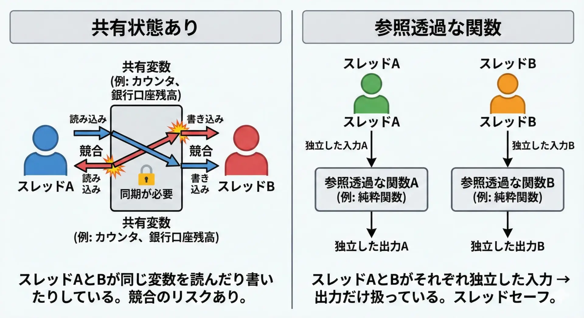 このため、関数型言語や関数型スタイルのプログラミングでは、参照透過な関数を増やし、副作用を持つコードを最小限に閉じ込めることが、並列処理の安全性を高める戦略としてよく用いられます。