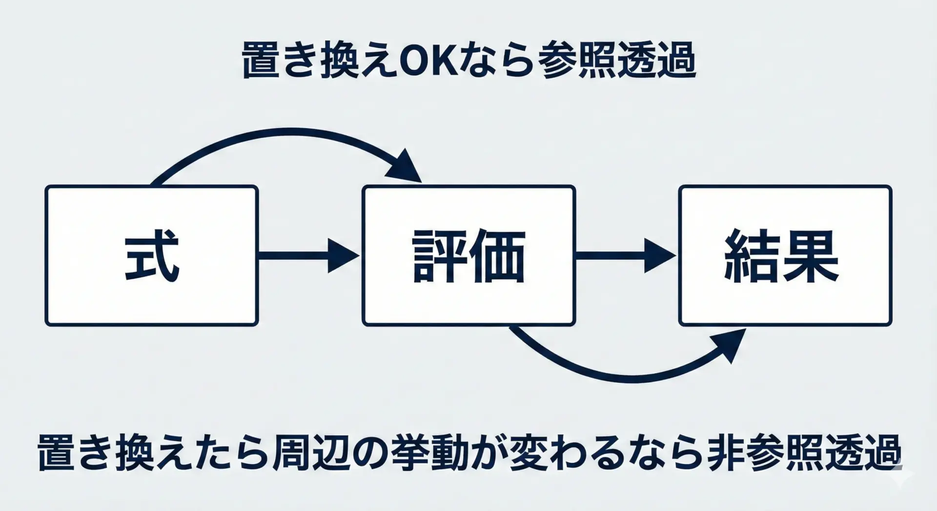 参照透過性 = 「同じ入力なら同じ結果」かつ「式を結果に置き換えても何も変わらない」と、2つセットで覚えておくと理解しやすくなります。