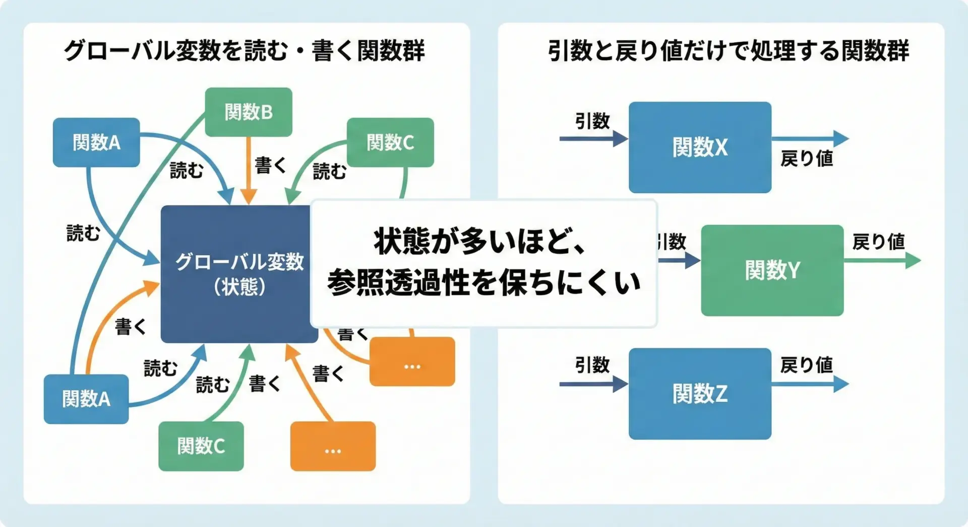 グローバル変数や共有状態を参照・更新するコードは、参照透過性を壊しやすく、その分だけ推論やテストが難しくなりがちだと覚えておくとよいでしょう。