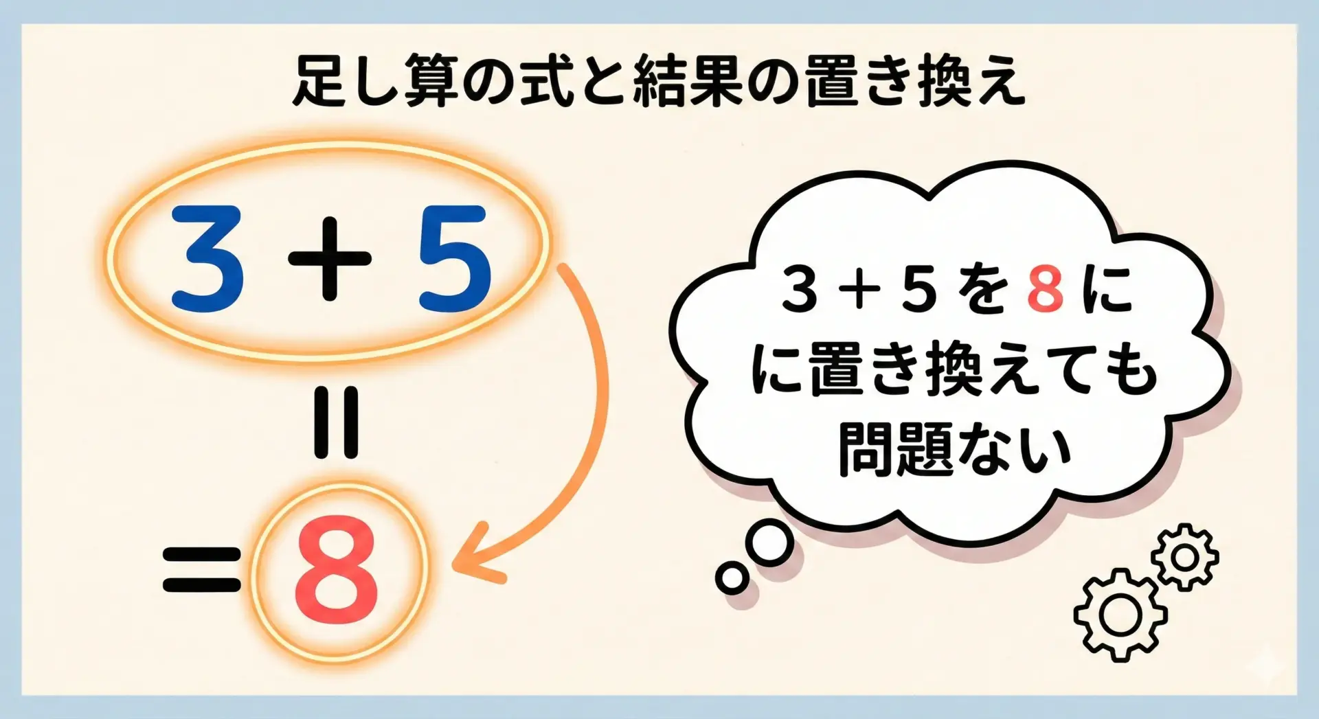 どんな文脈であっても、式3 + 5を、その結果である8に置き換えても、全体の意味は変わりません