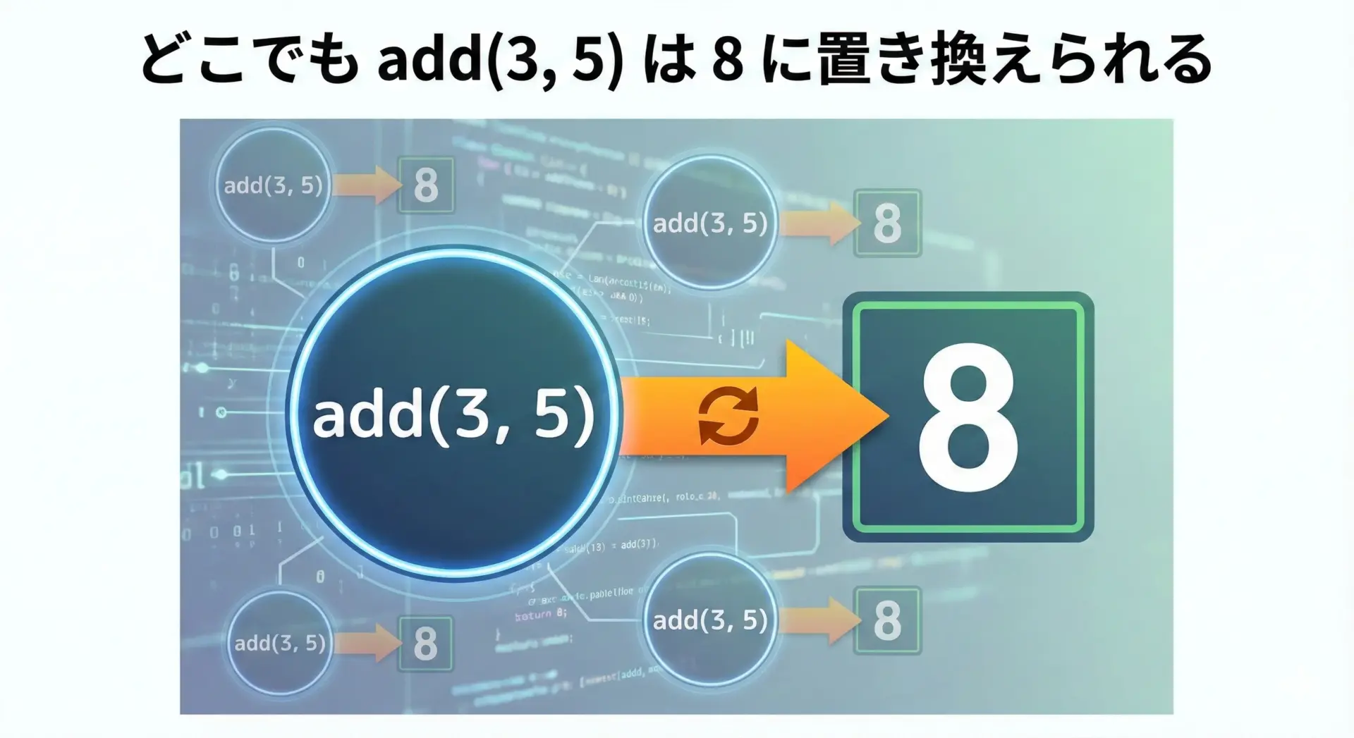 途中の「3 + 5」を「8」にしてしまっても計算全体に悪影響がない、つまり参照透過だといえます。