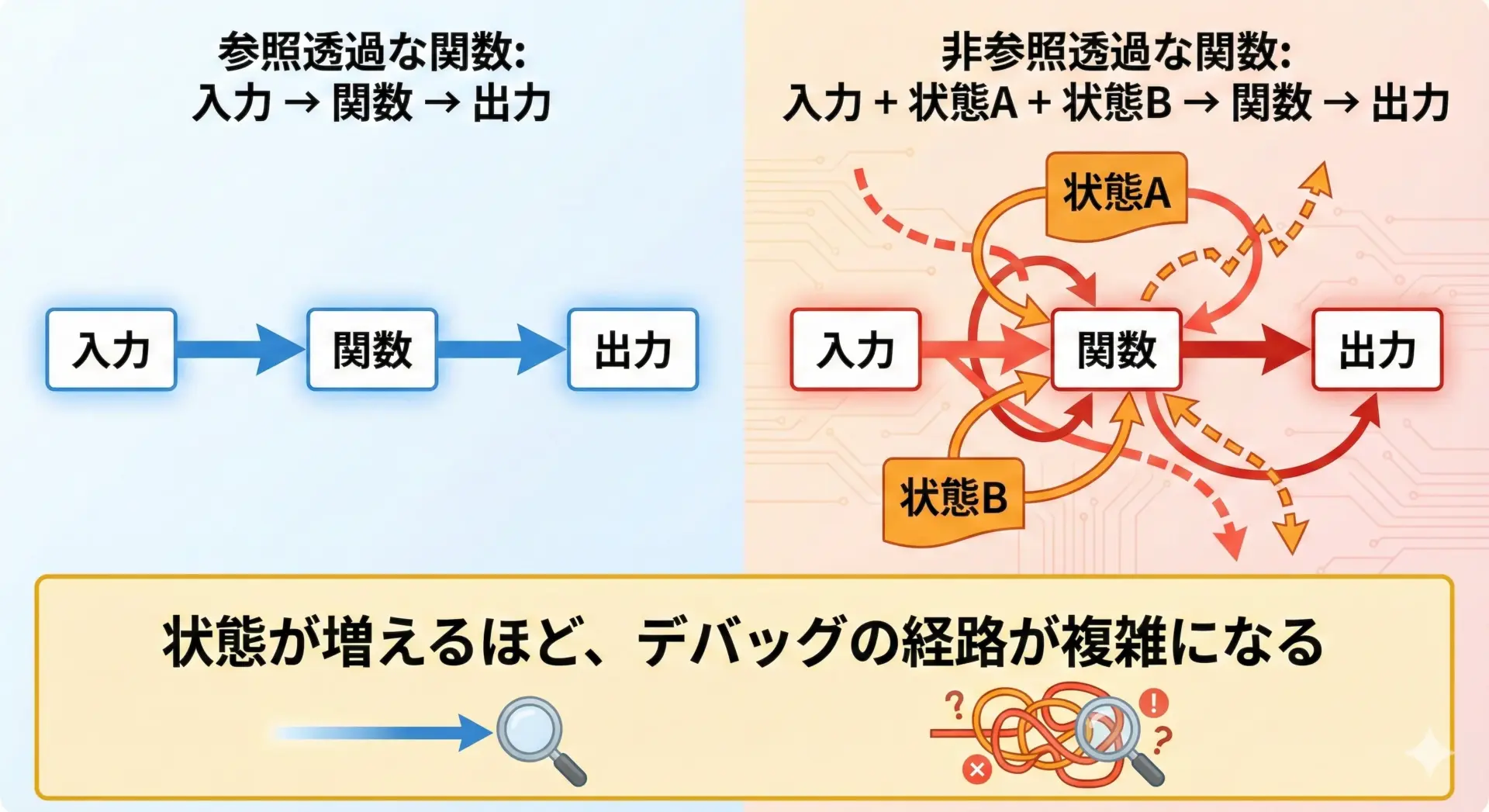 一方で、非参照透過な関数が多いコードでは、「この時点でグローバル変数は何だったか」「前にどんな関数が呼ばれていたか」など、周辺の状況まで遡って追いかける必要があります