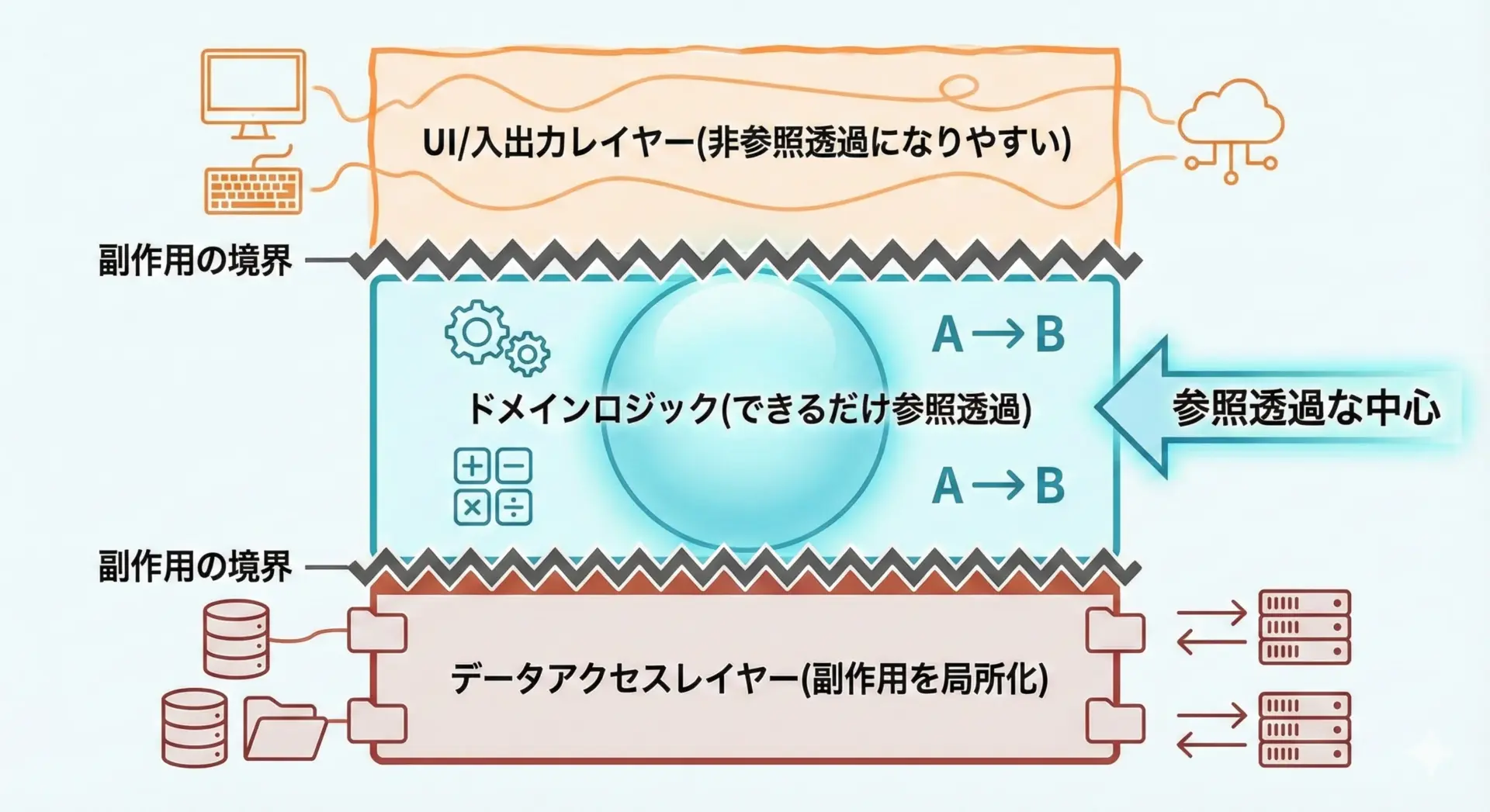 そのため、ロジック部分はできるだけ参照透過にし、副作用を持つコードを周辺に局所化するという設計が重要です。