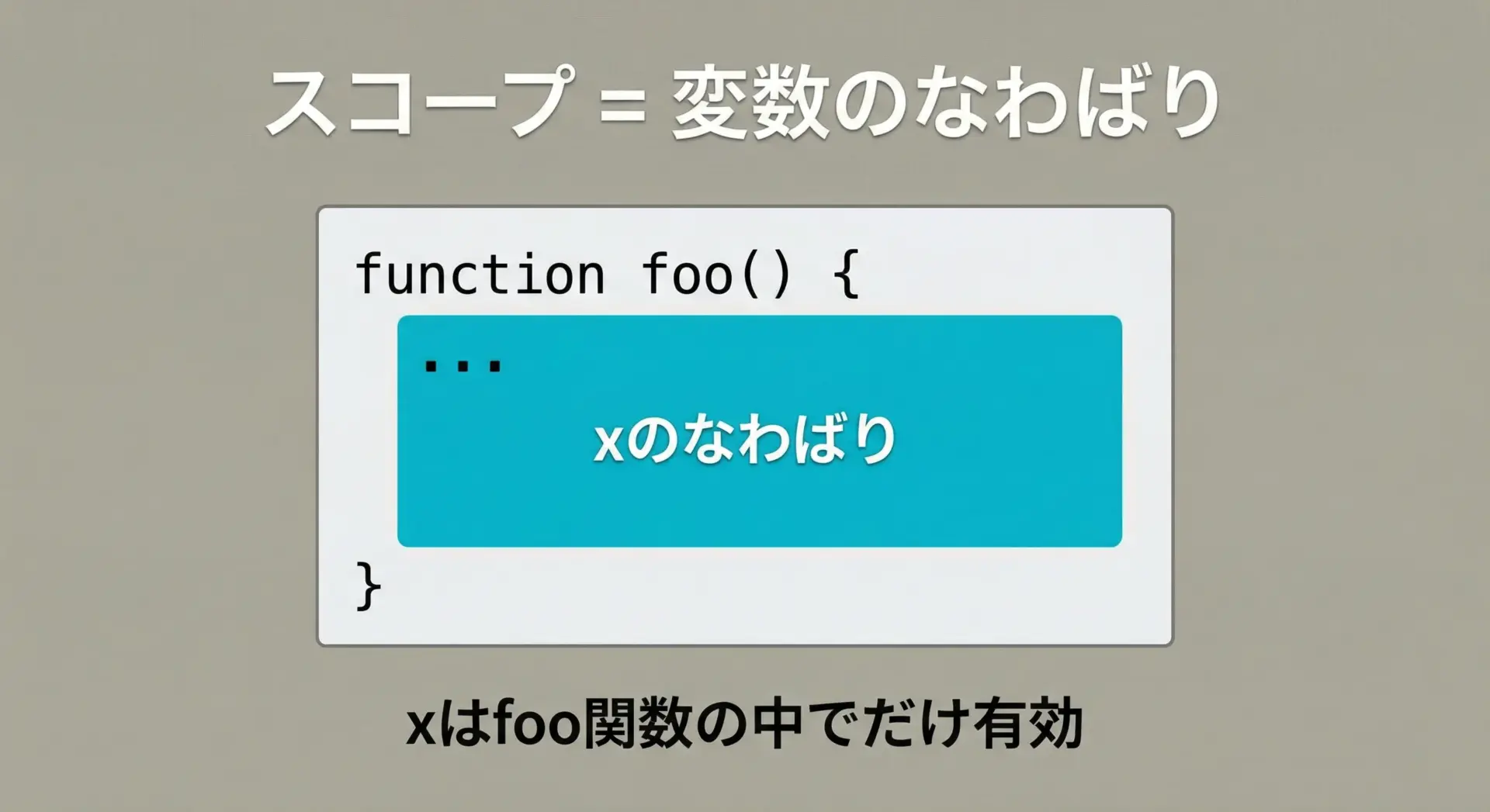 ここではまだ「スコープ = 変数の見える範囲」と押さえておけば十分です。