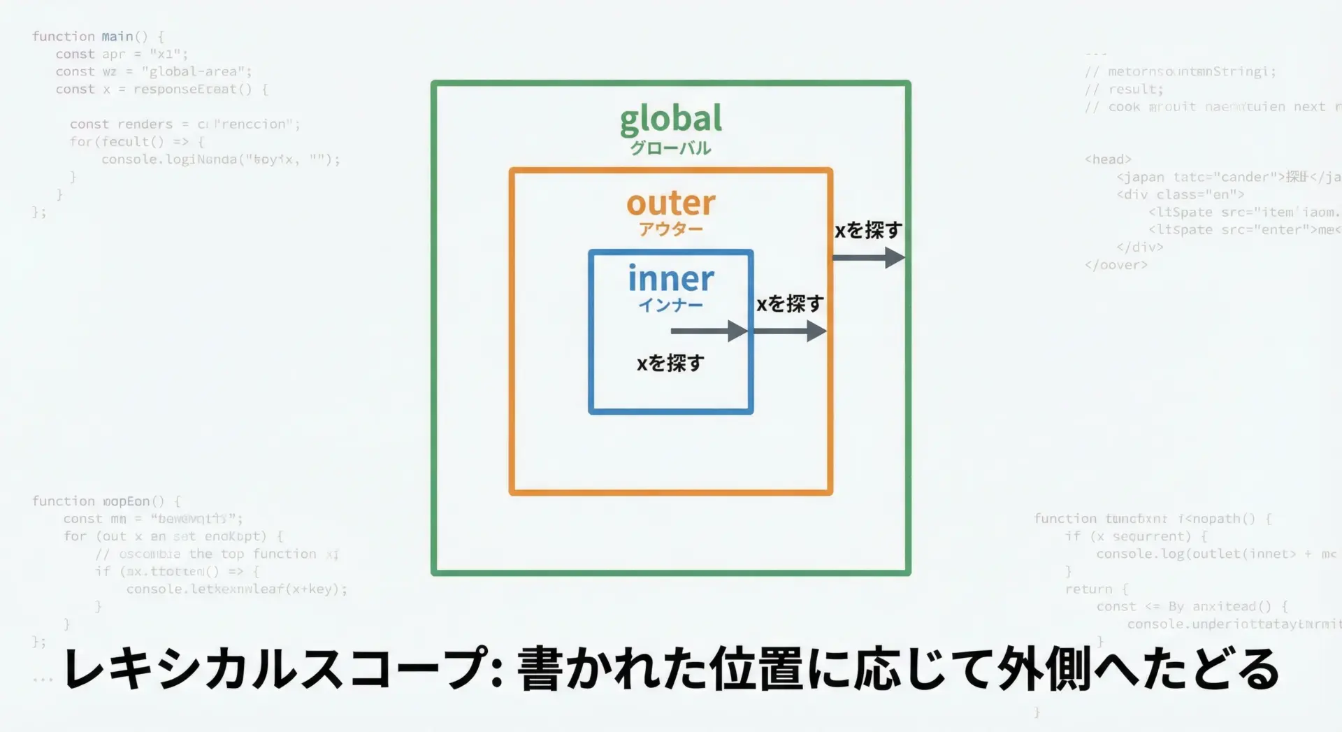 JavaScriptはレキシカルスコープ(静的スコープ)と呼ばれるルールを採用していて、変数がどこから探されるかは、コードの“書かれている位置”で決まります。