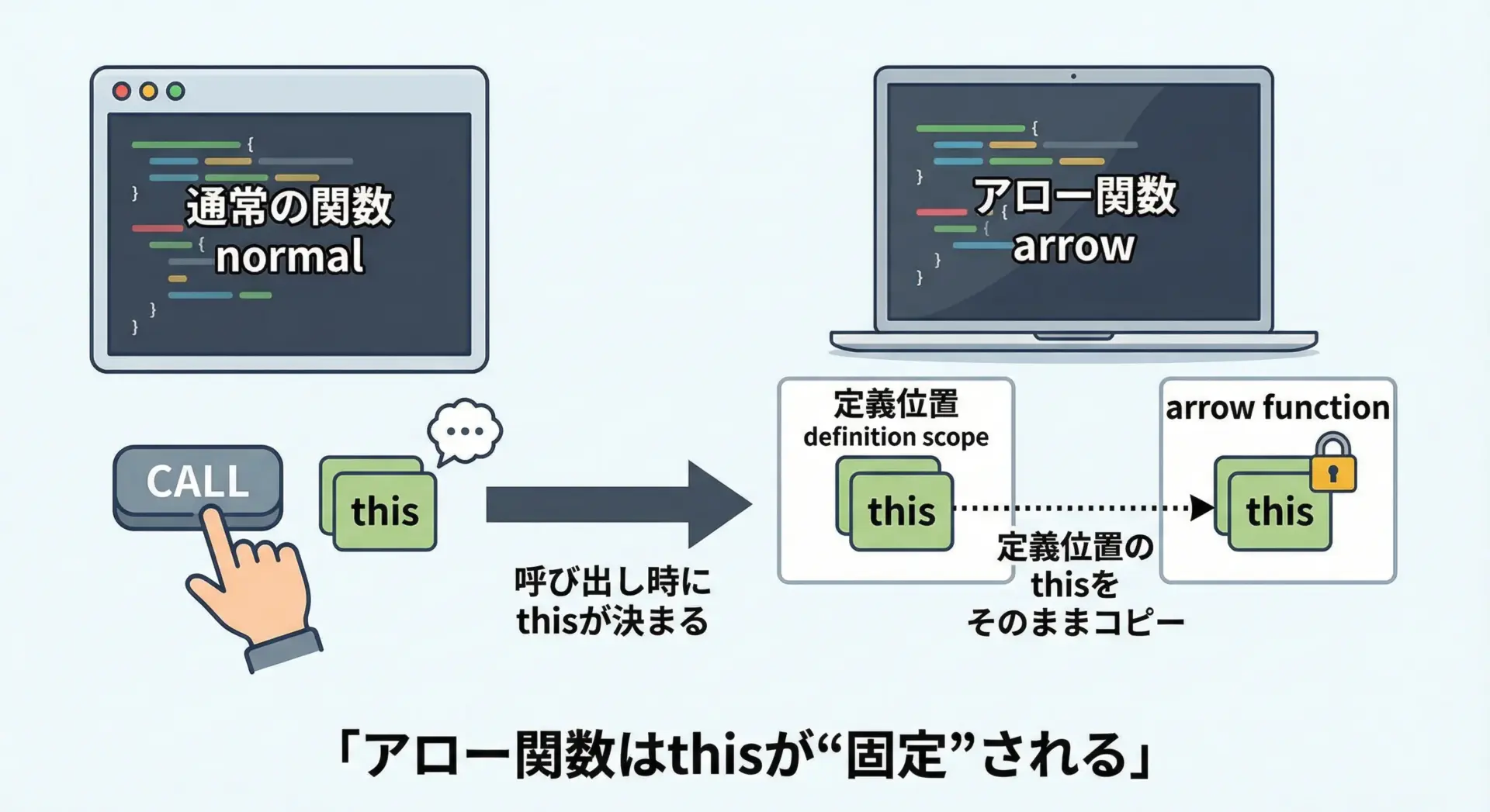 - アロー関数: 自分自身ではthisを決めず、定義された場所のthisをそのまま「引き継ぐ」