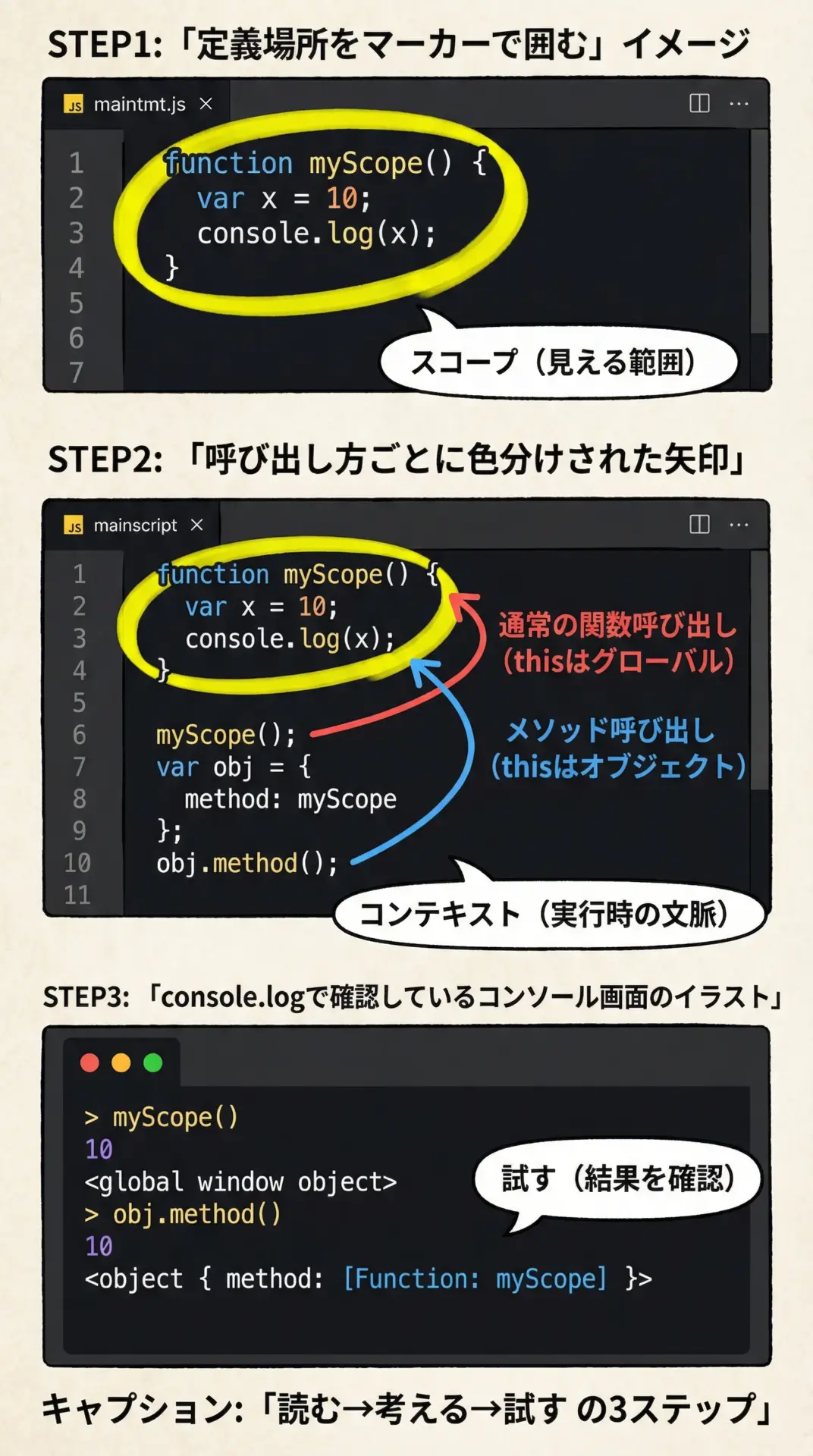 この「定義場所 → 呼び出し方 → 実験」のサイクルを回していくことで、スコープとコンテキストへの感覚がだんだんと身についていきます。