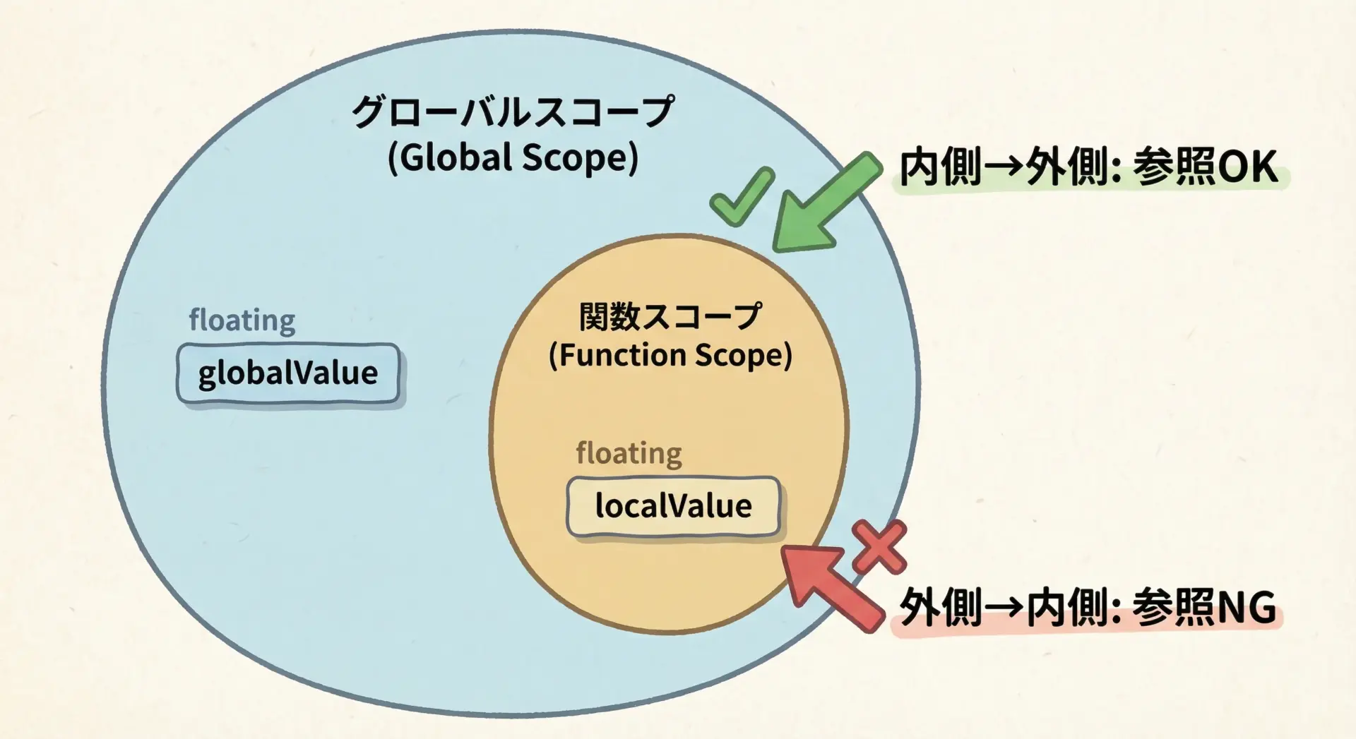 内側から外側は見えるが、外側から内側は見えないというのが、グローバルスコープとローカルスコープの関係です。