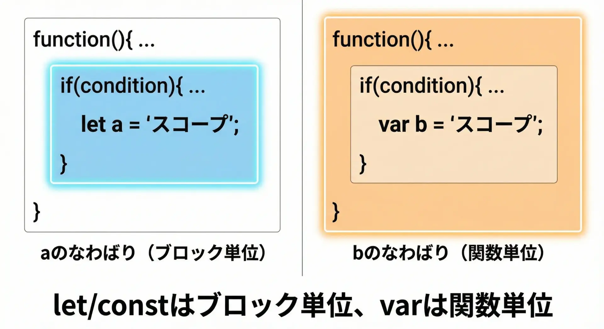 一方、varで宣言した変数は関数スコープを持ち、ifやforブロックは無視されて、関数全体がスコープになります。