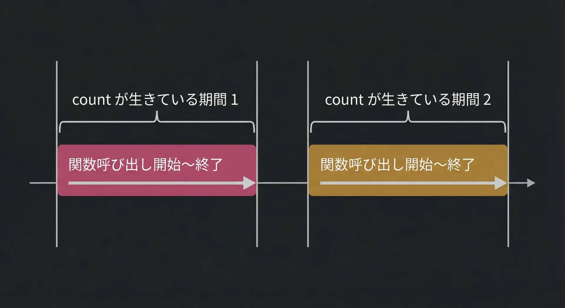 この例では、counterを呼ぶたびに新しくcountが作られ、関数の終わりで破棄されます。