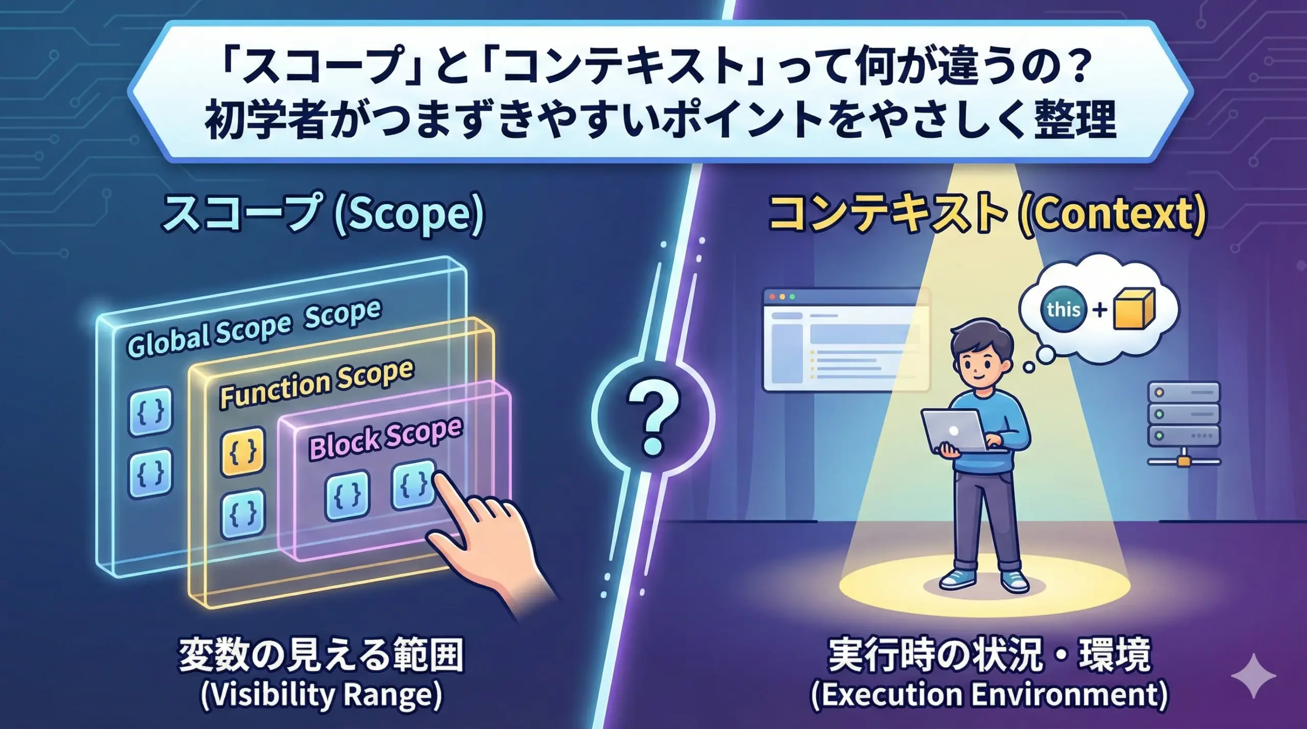 本記事では、JavaScriptを例にしながら、スコープとコンテキストの違いをコードと図解で丁寧に整理していきます。