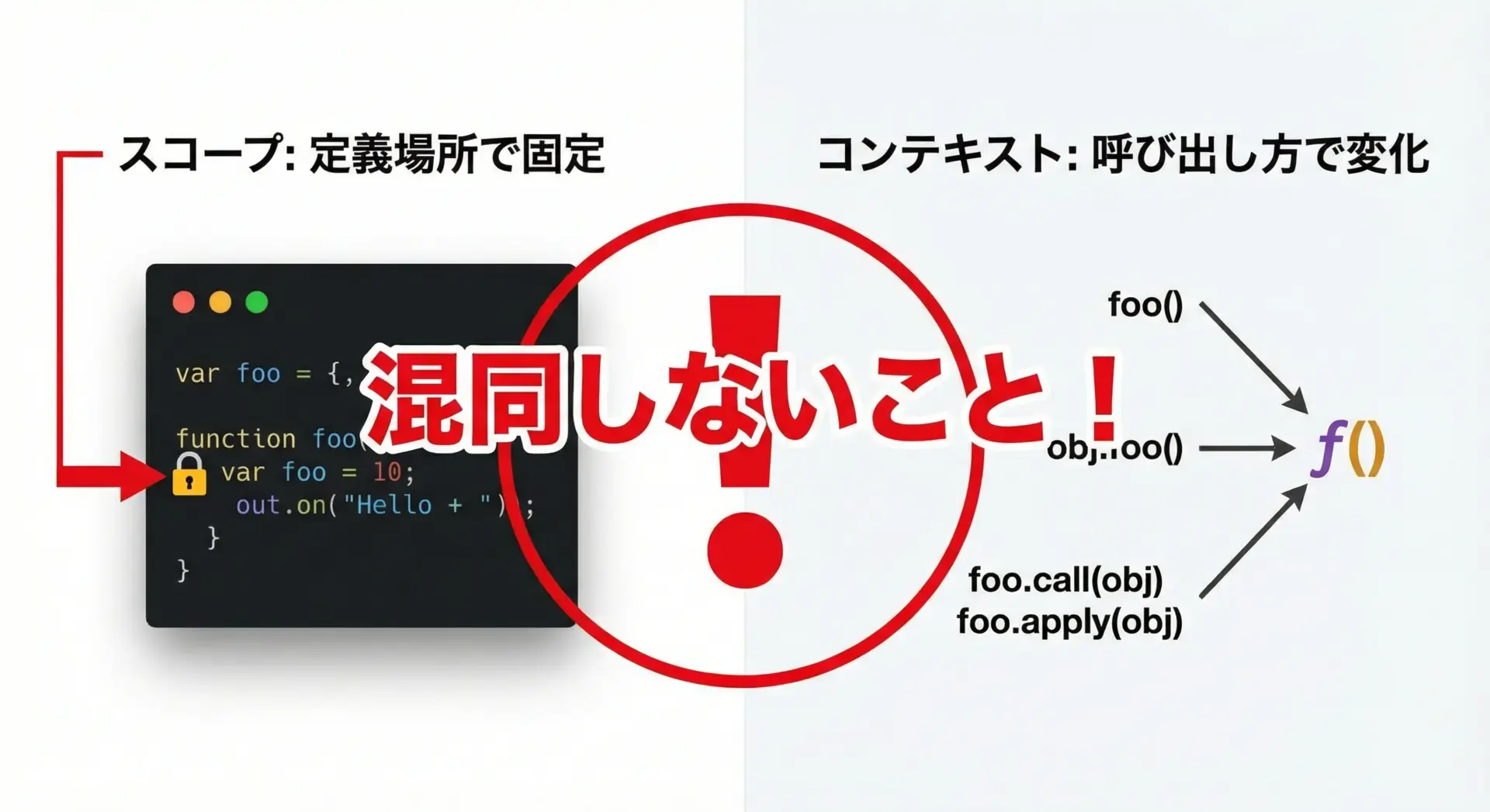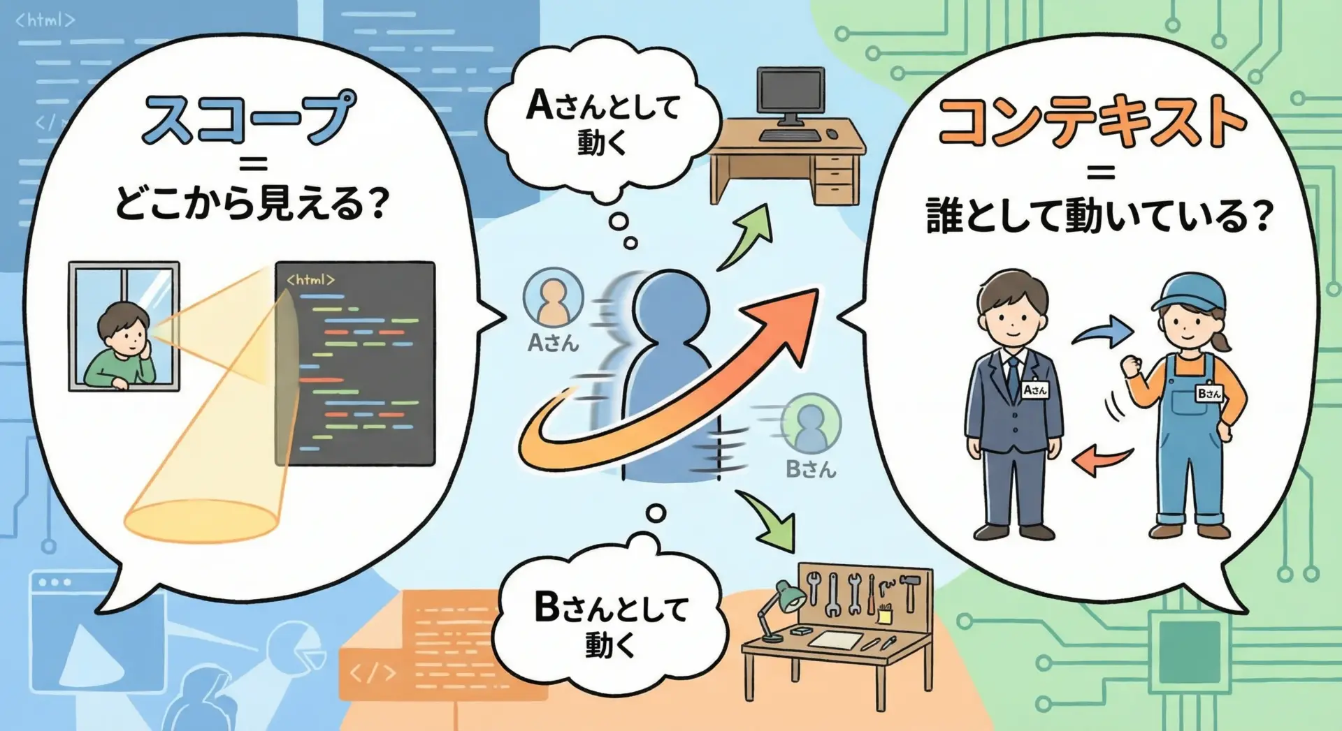 どちらも「その変数(やthis)が、どこから・どうやって使えるのか」に関わる重要な概念ですが、名前も雰囲気も似ているため、初学者の方が混乱しがちなポイントでもあります。