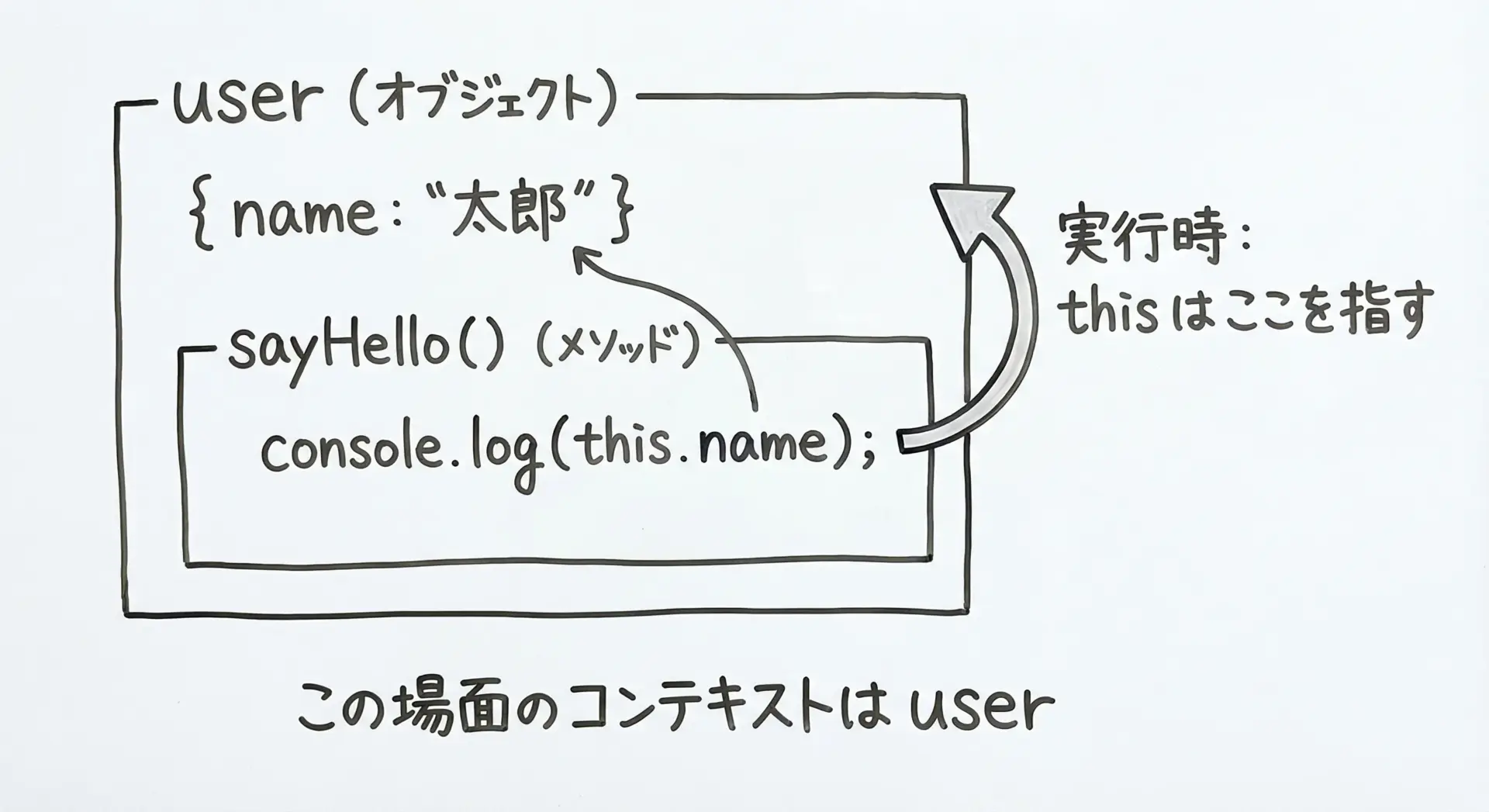 コンテキストはよく「実行コンテキスト(execution context)」という言い方もされますが、初学者のうちは「今、その関数は“誰として”動いているか」とイメージすると理解しやすくなります。