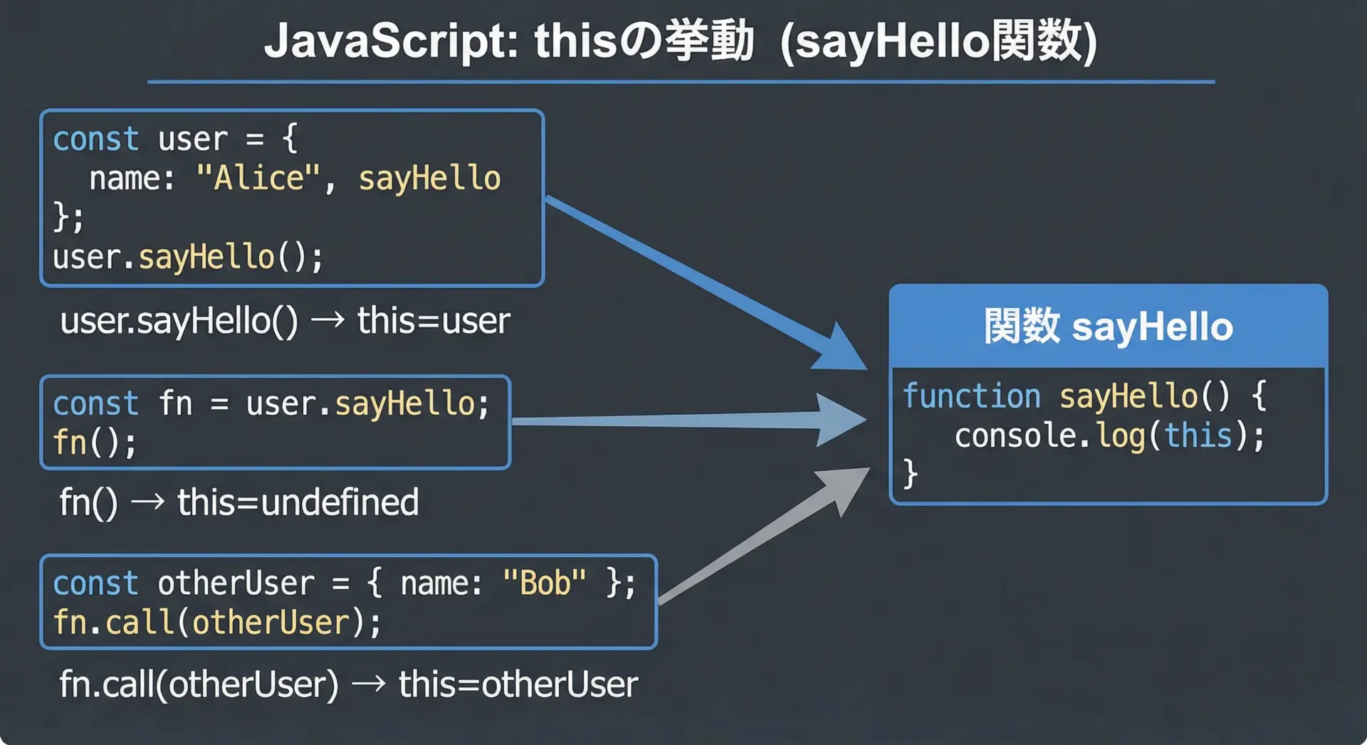 「どこに書かれているか」ではなく「どう呼ばれたか」でthisが決まる、というのがコンテキストの本質です。