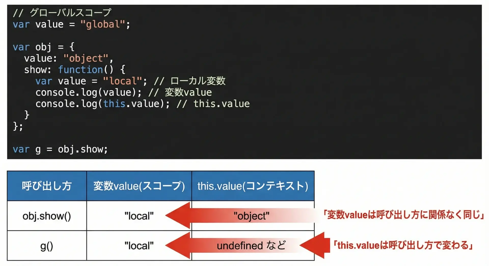 - コンテキスト: thisが何を指すか(呼び出し方で決まる)