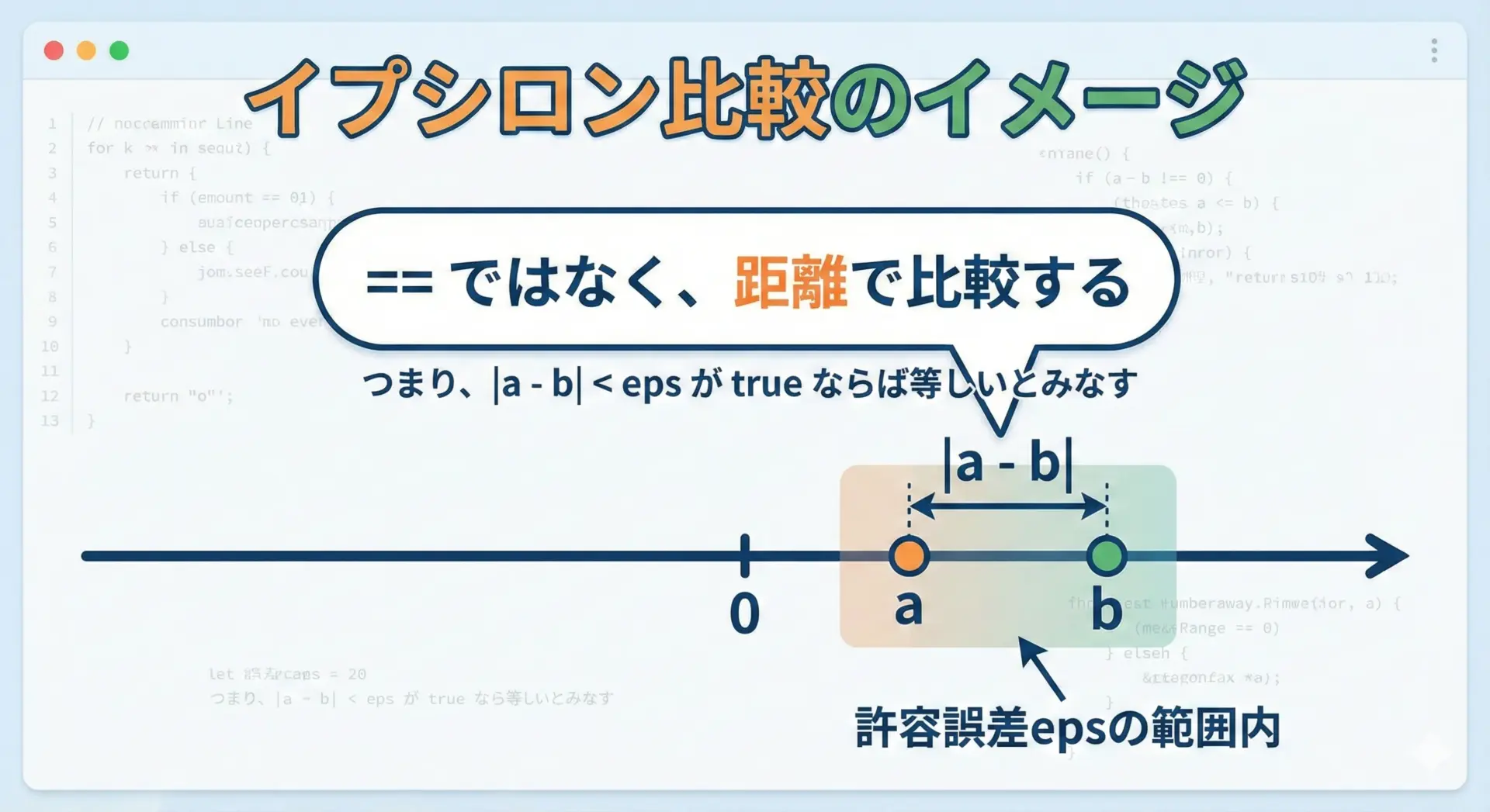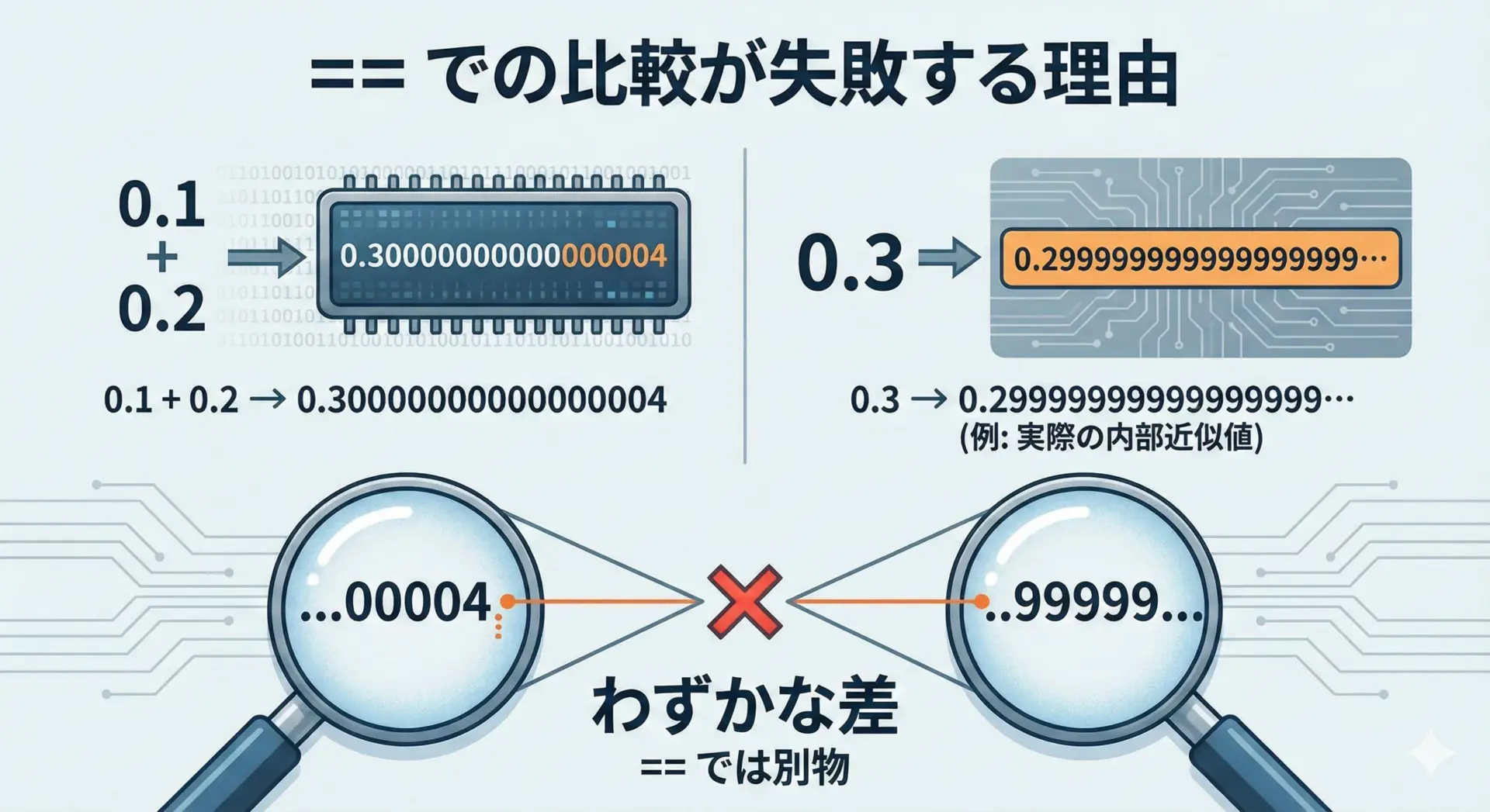 浮動小数点数を比較するときは、「完全一致(==)」ではなく「ある許容範囲内かどうか」を基準にするのが定石です。