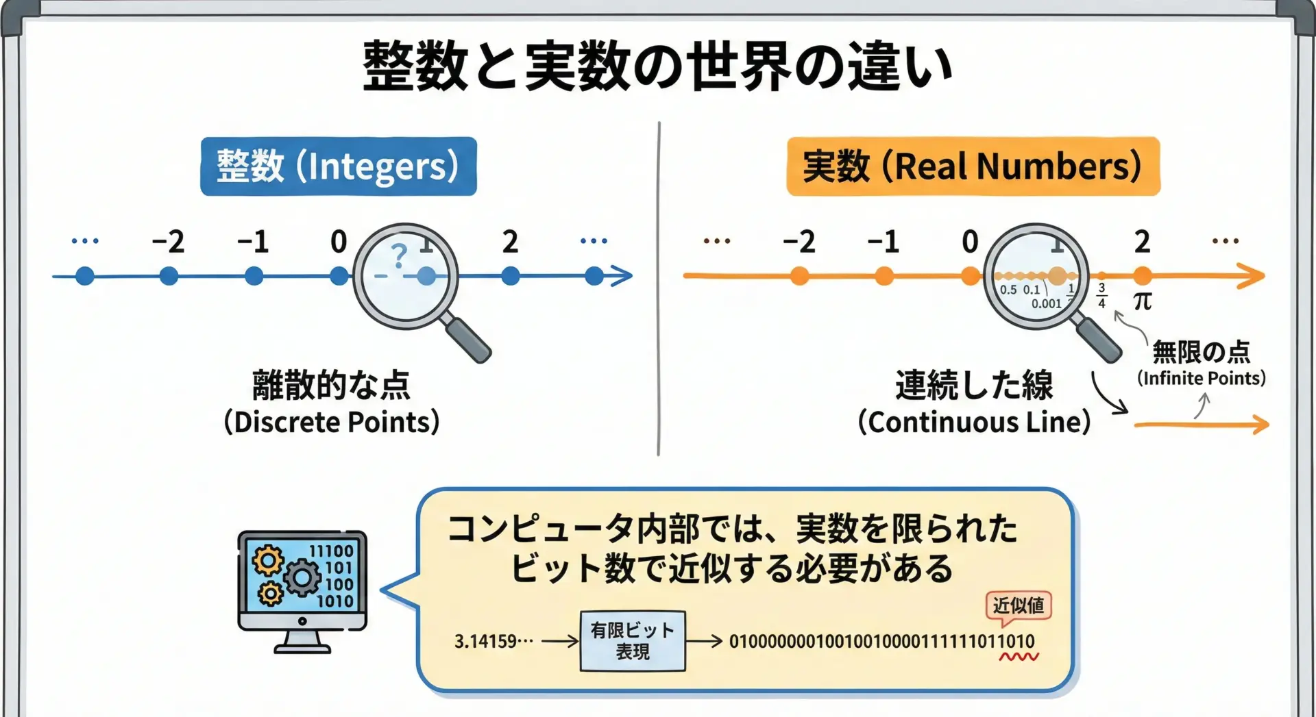 まずは、整数との違いから「実数」をどのように近似しているのかを見ていきます。