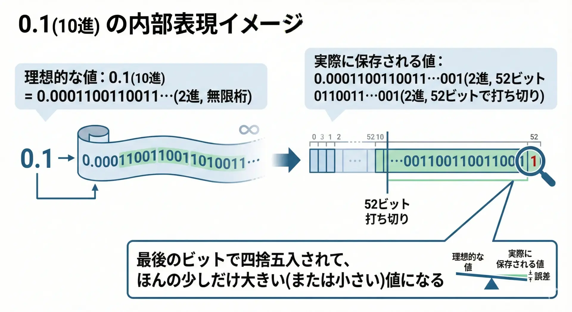 • 1や0.2は、2進数では無限に続く小数になるため、内部では丸められた近似値として保存されます。