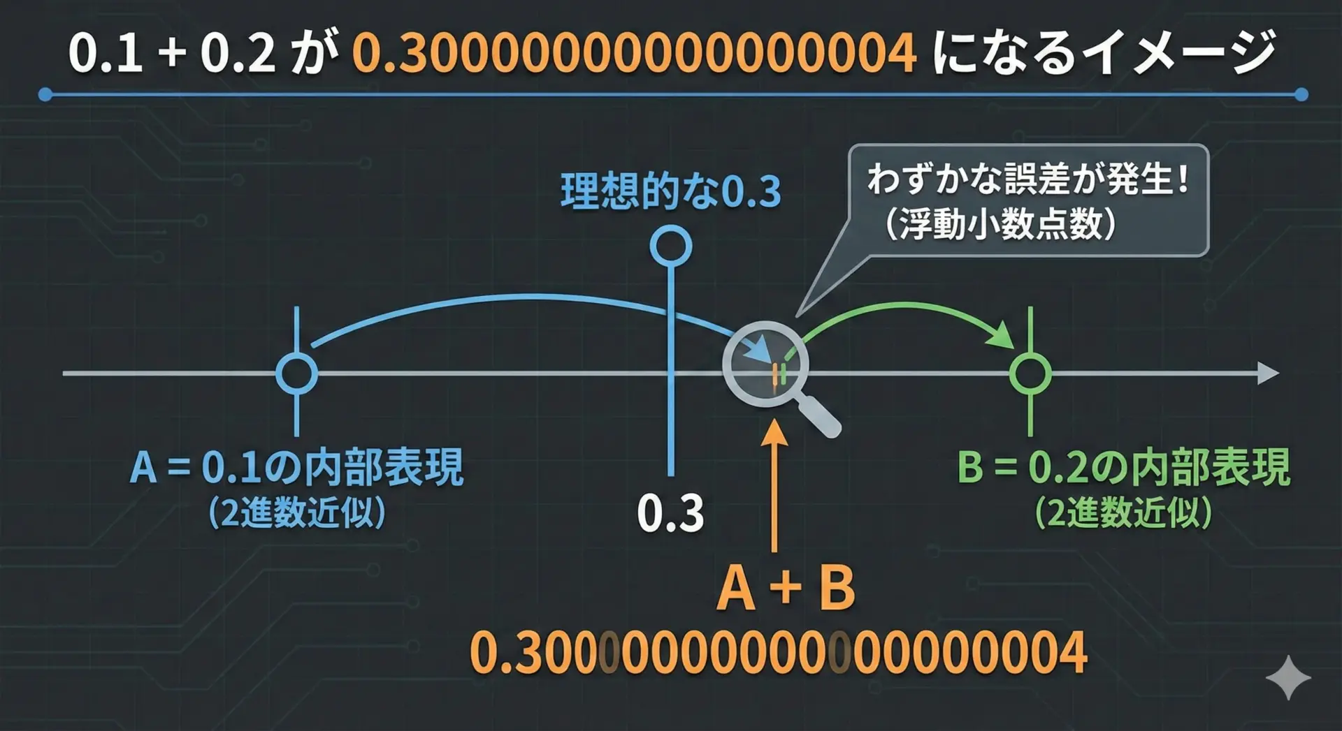 これは、0.1や0.2が「2進数ではぴったり表現できない」ことに由来します。
