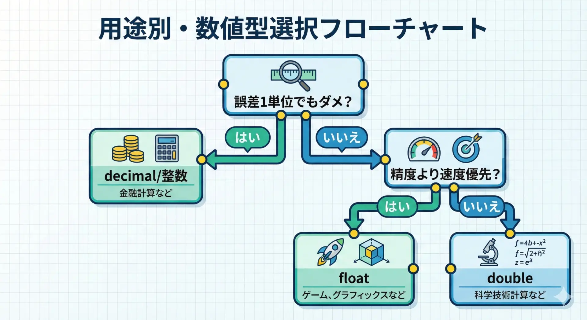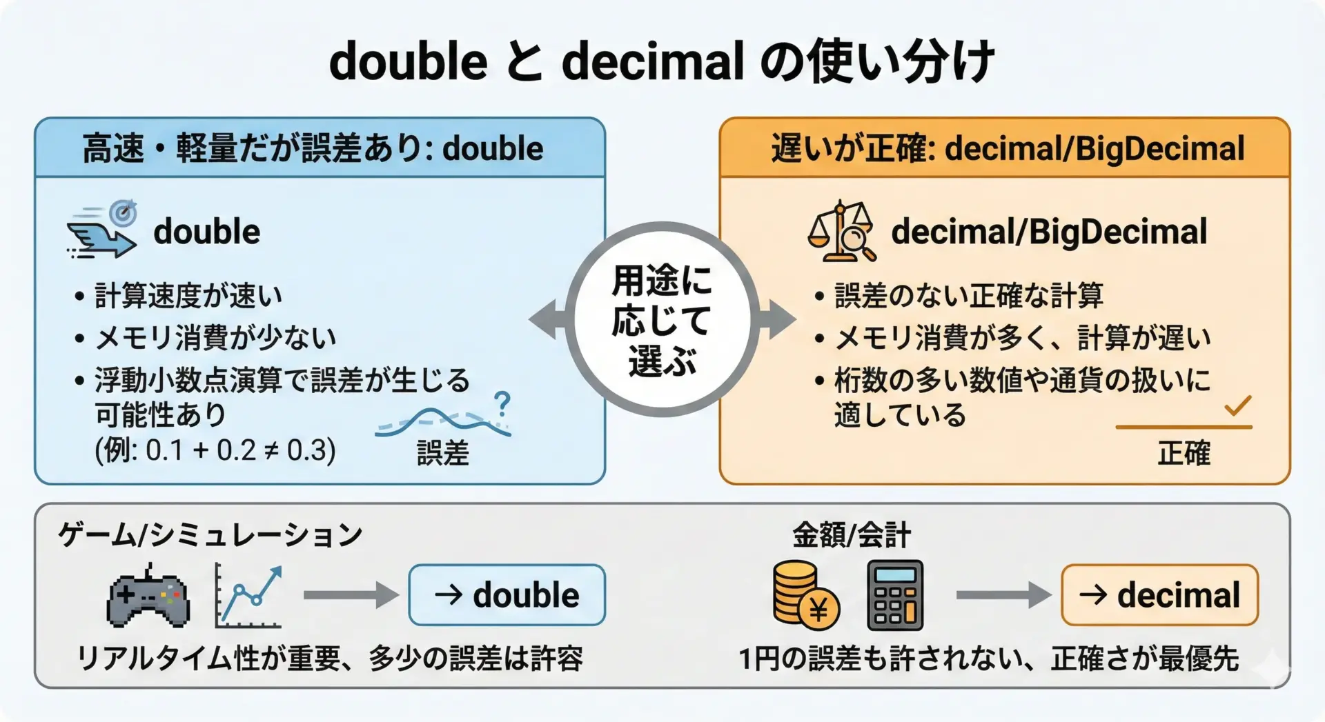 • double、float、decimal(あるいは整数)など、用途に応じて最適な数値型を選ぶことが、信頼性の高いプログラムにつながります。