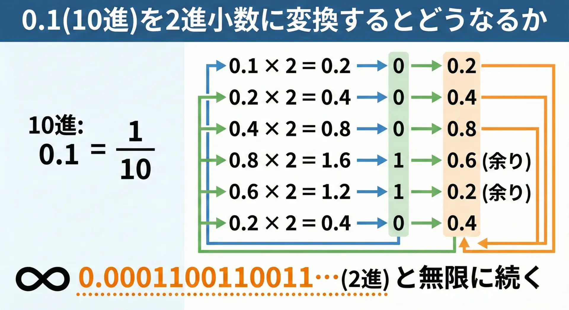 このように、10進数で有限桁の小数でも、2進数では無限に続く小数になってしまう場合があります。