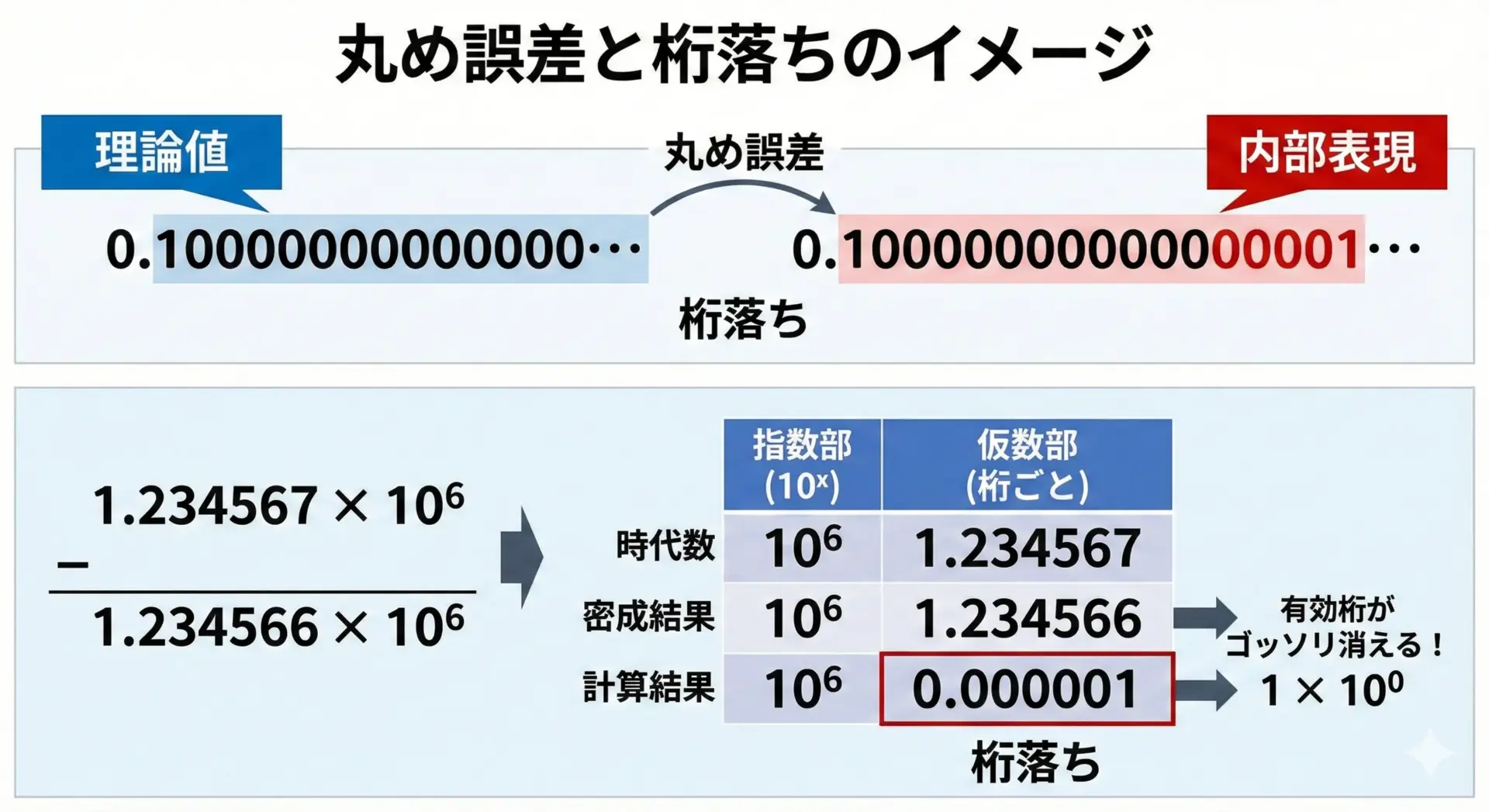 一方、桁落ちは、ほぼ同じ大きさの数値同士を引き算したときに有効桁が失われる現象です。
