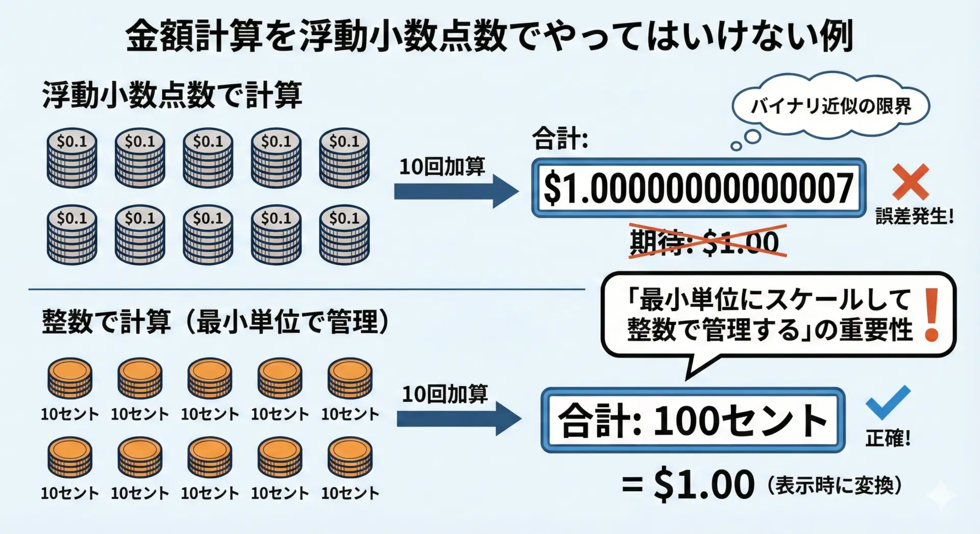 金額、ポイント、在庫数など、「1単位」でもズレてはいけない分野では、浮動小数点数をそのまま使うのは危険です。