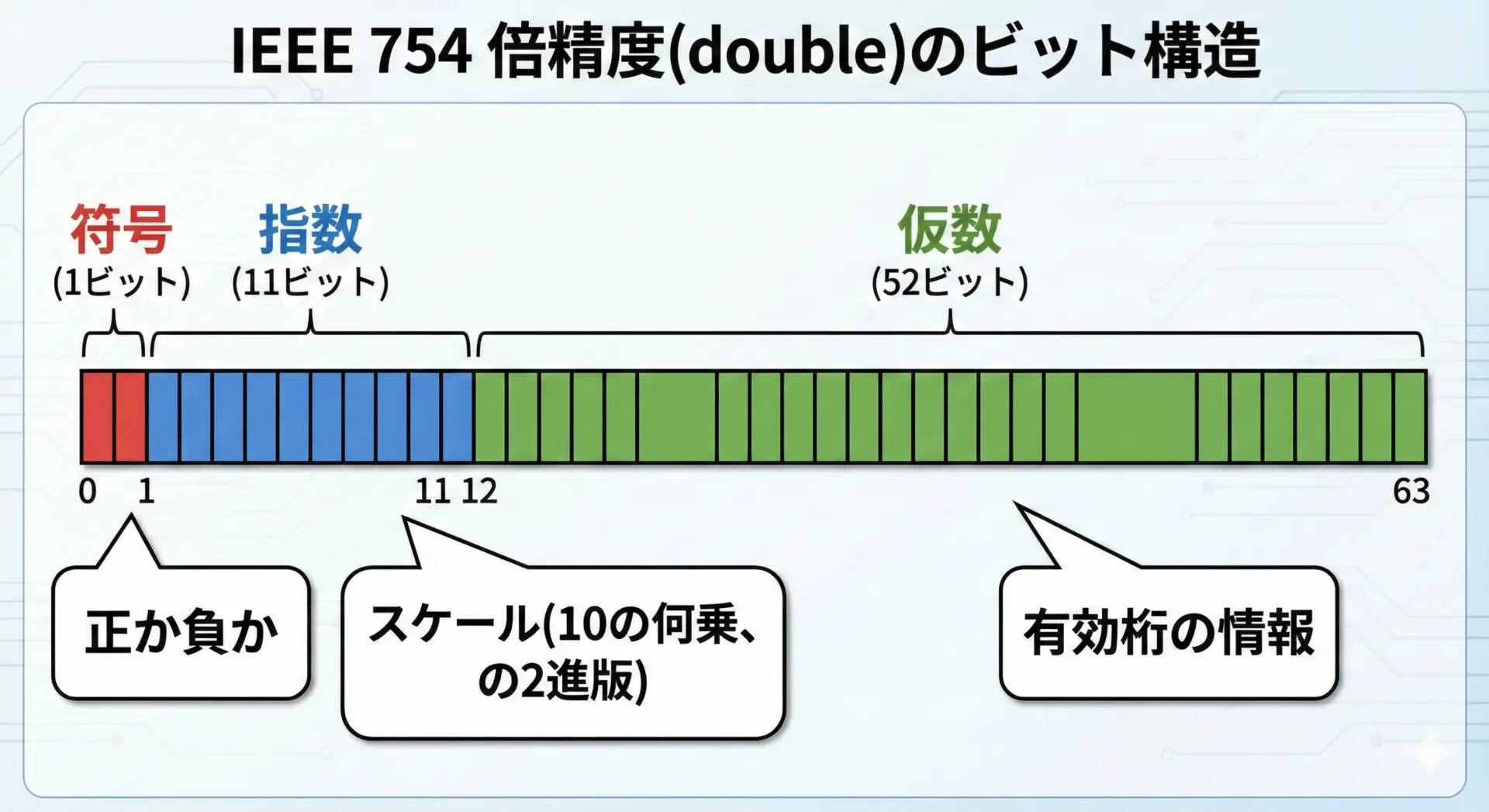 IEEE 754の倍精度は、次の3つの要素から構成されます。