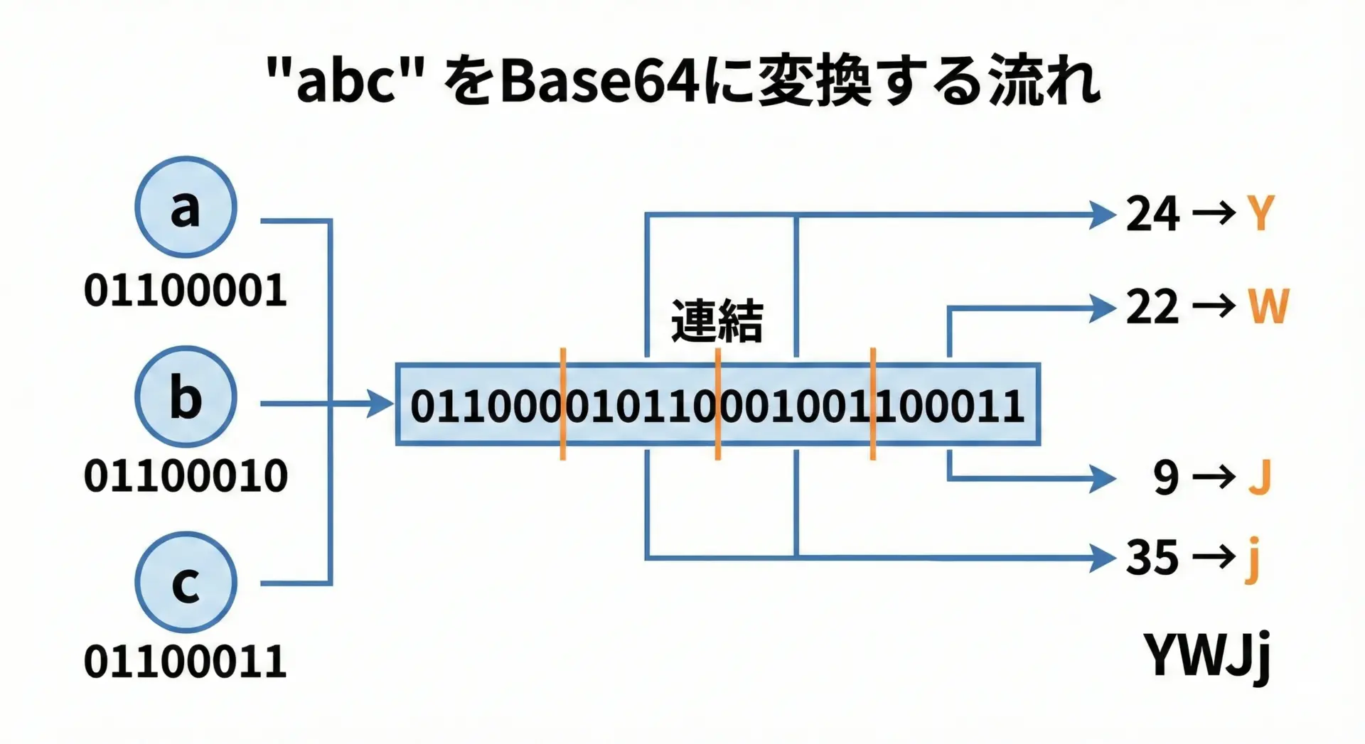 Base64エンコーディングとは、バイナリデータ(0と1の列)を、限定された64種類の文字だけを使って表現するためのルールです。
