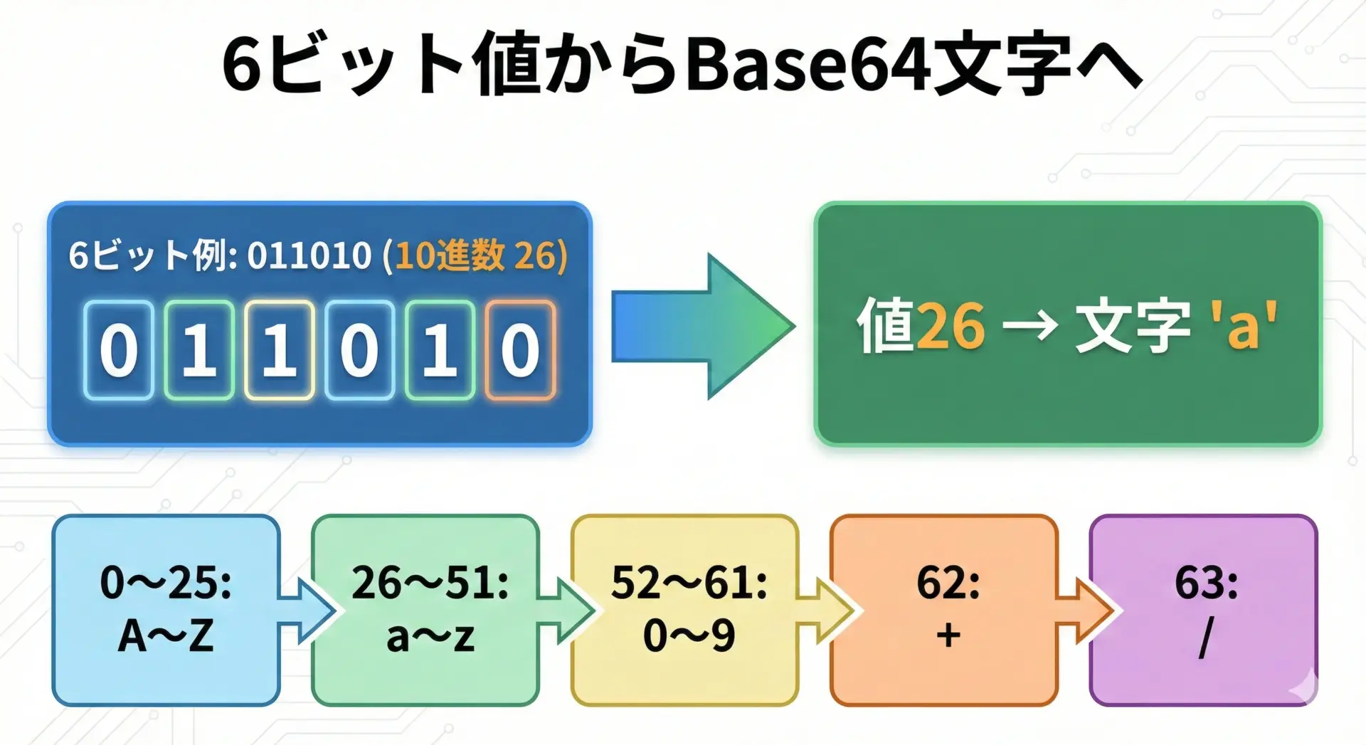 Base64エンコーディングは、一見すると「謎の記号の列」を生み出す不思議な仕組みのように見えますが、その中身は3バイトを24ビットとして扱い、6ビットごとに64種類の文字へマッピングするだけの、非常にシンプルで規則的な変換です。