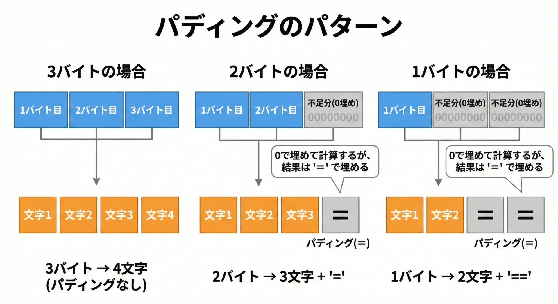 Base64では、次のように余りバイト数に応じて'='を付け加えます。