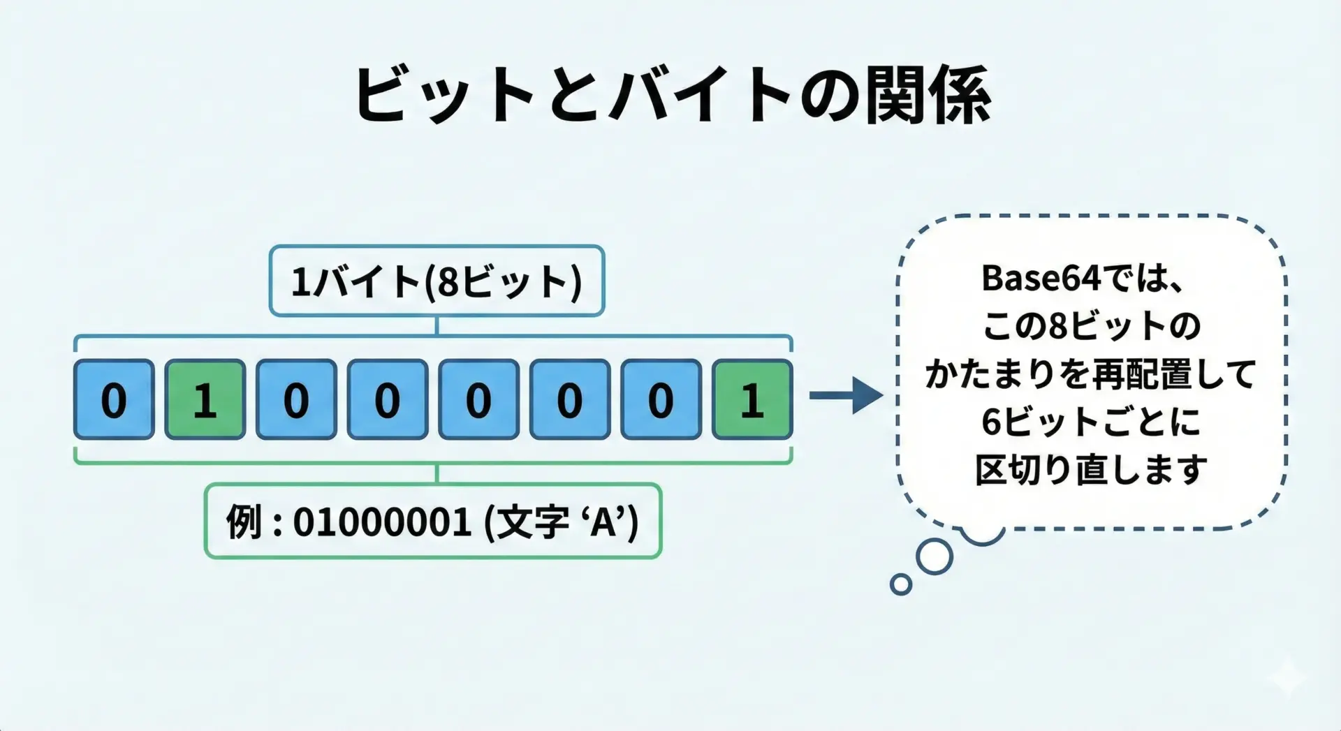 Base64の仕組みを理解するには、まずビット(bit)とバイト(byte)の関係を押さえる必要があります。