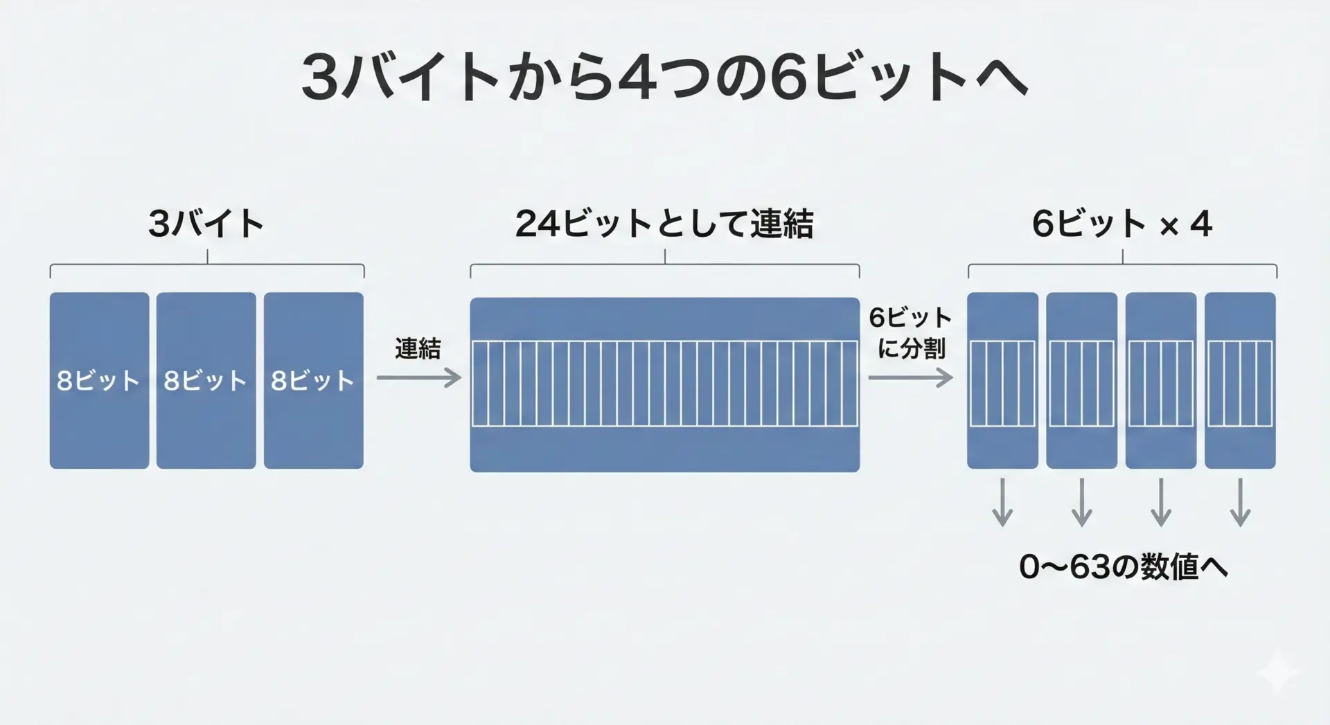 このように、実際に手で追ってみると「3バイト → 24ビット → 6ビット × 4 → 4文字」というパターンがはっきりイメージできるようになります。