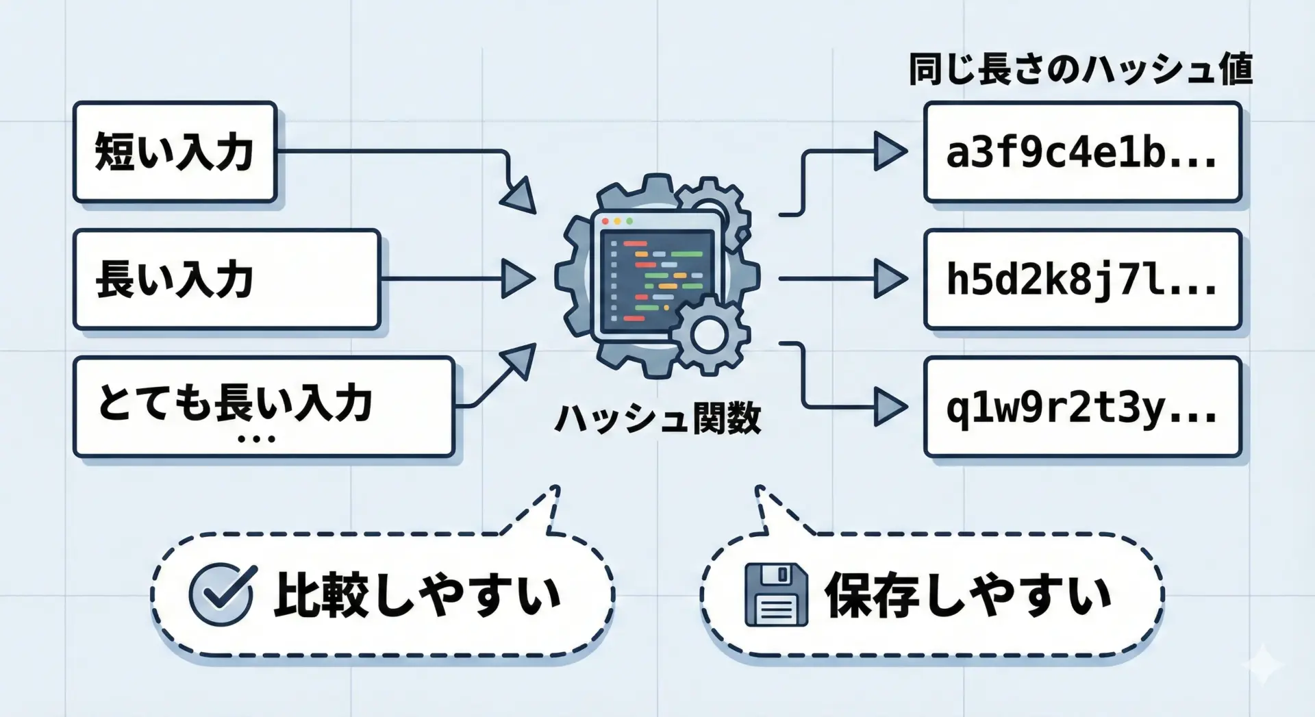 ハッシュ関数の重要なポイントは、どんな長さの入力でも、決まった長さの出力に変換することです。