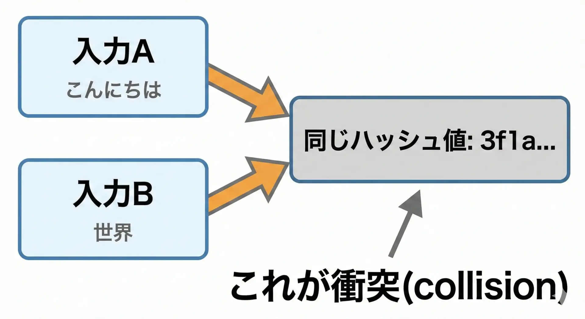 衝突(collision)とは、異なる2つの入力から同じハッシュ値が得られてしまう現象のことです。