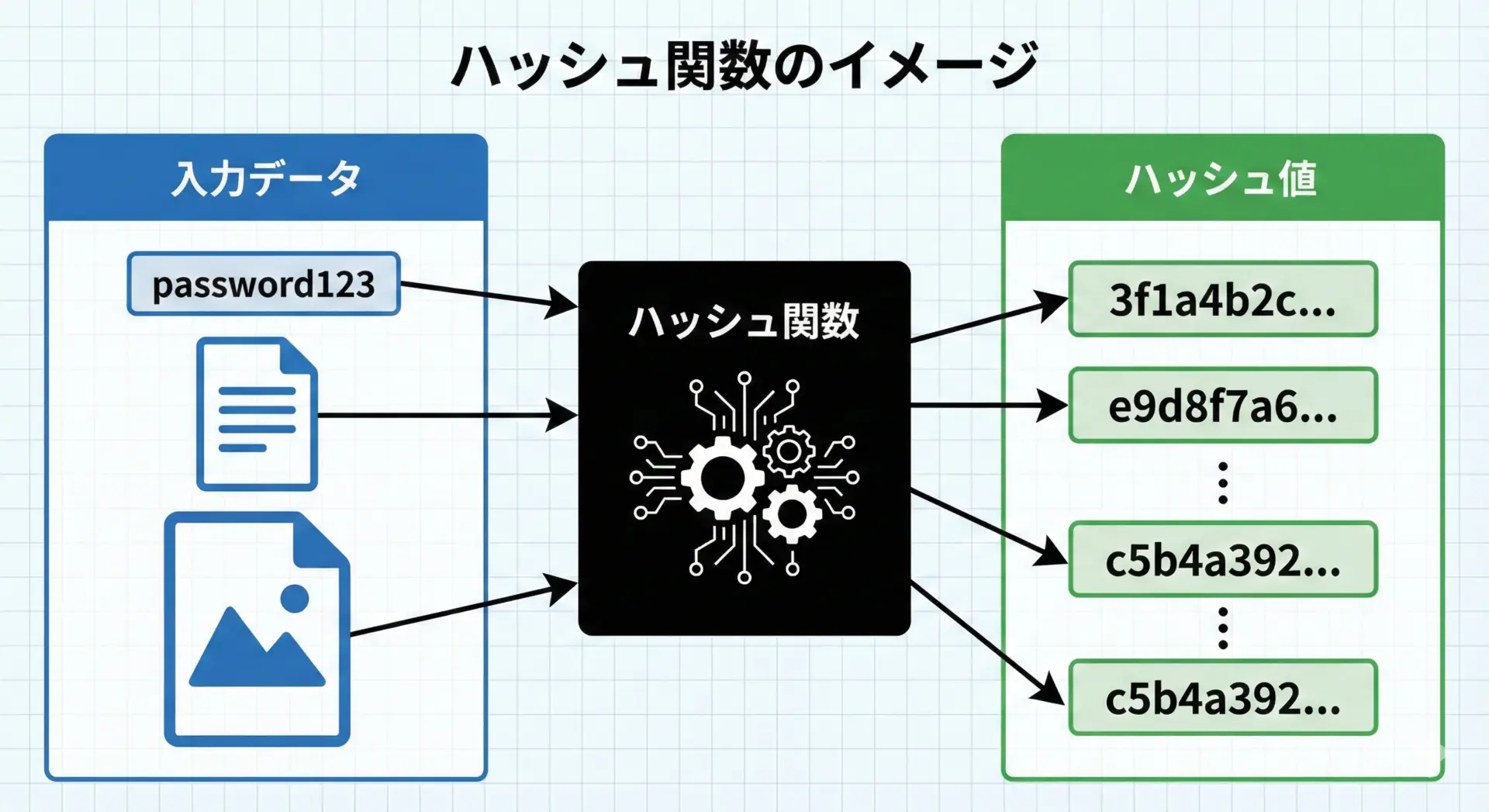 ハッシュ関数(hash function)とは、あるデータ(入力)を受け取り、一定のルールにしたがって、固定長の「ハッシュ値」と呼ばれるデータに変換する関数のことです。